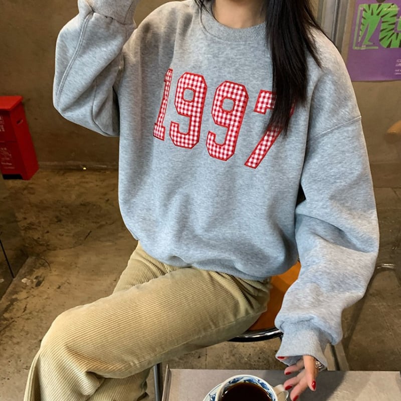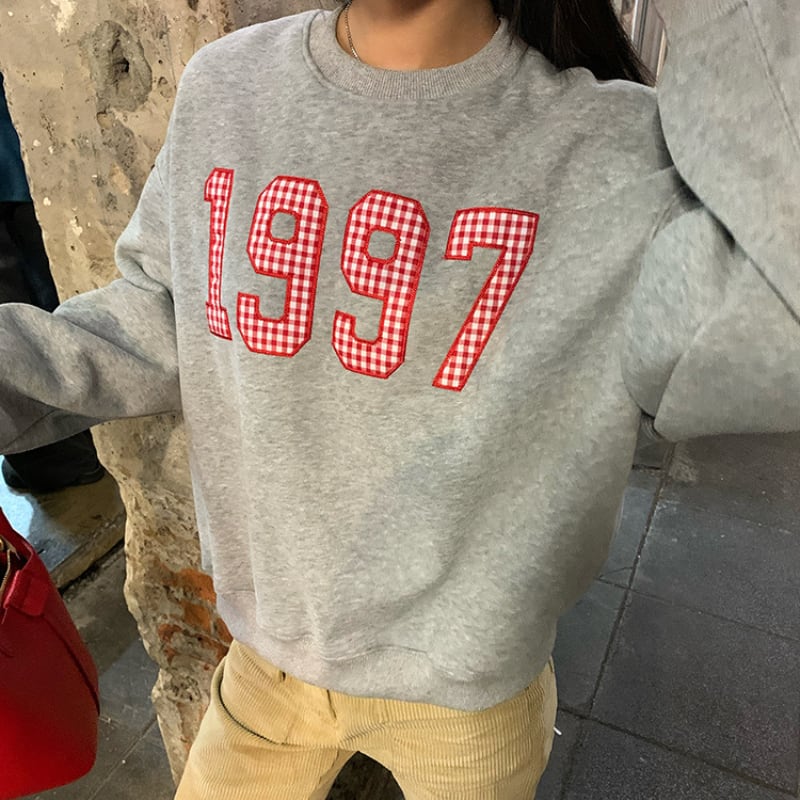 gingham check number embroidery sweat pullover  e1743