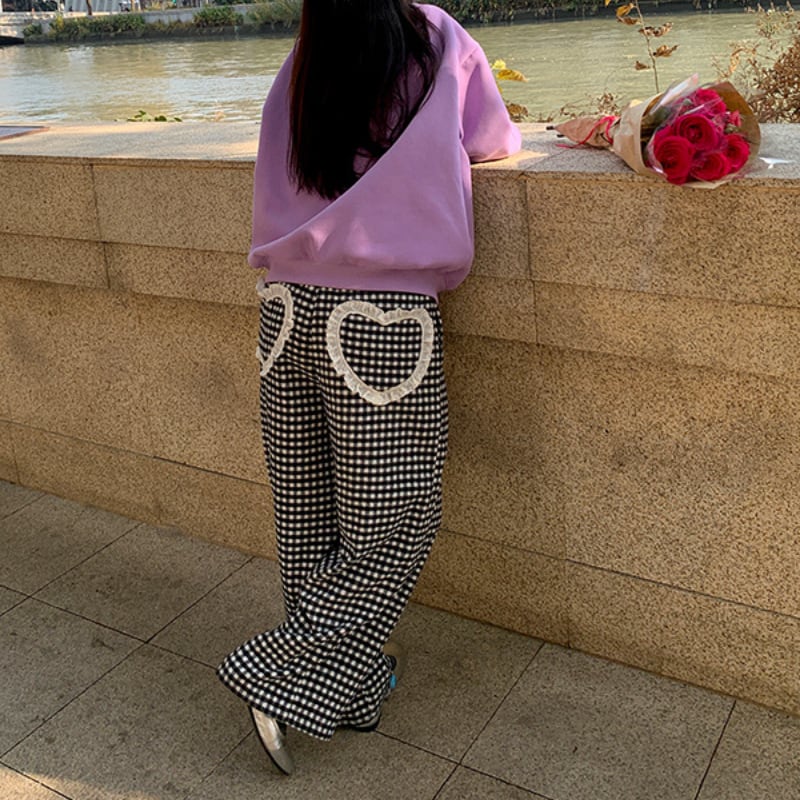 back lace heart wool like gingham check pants e1808