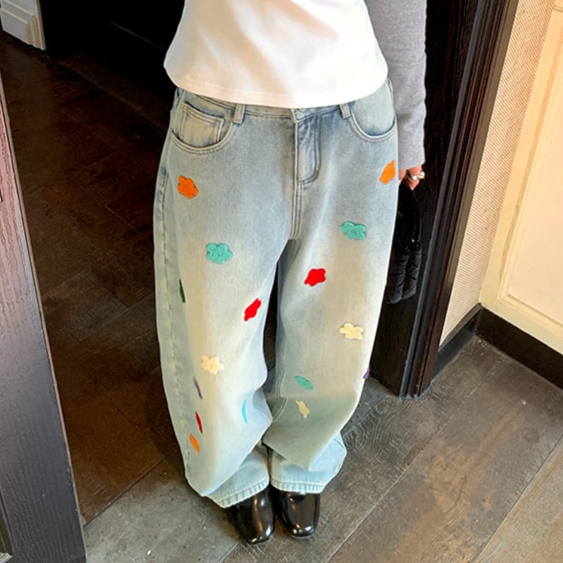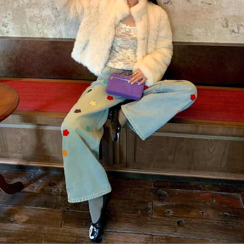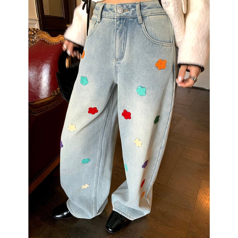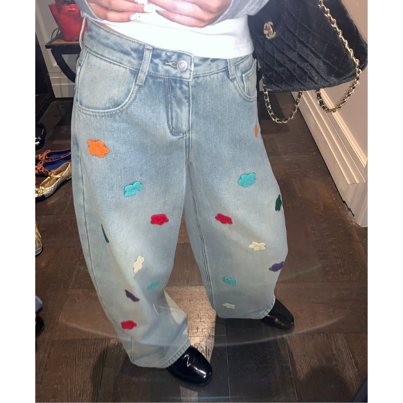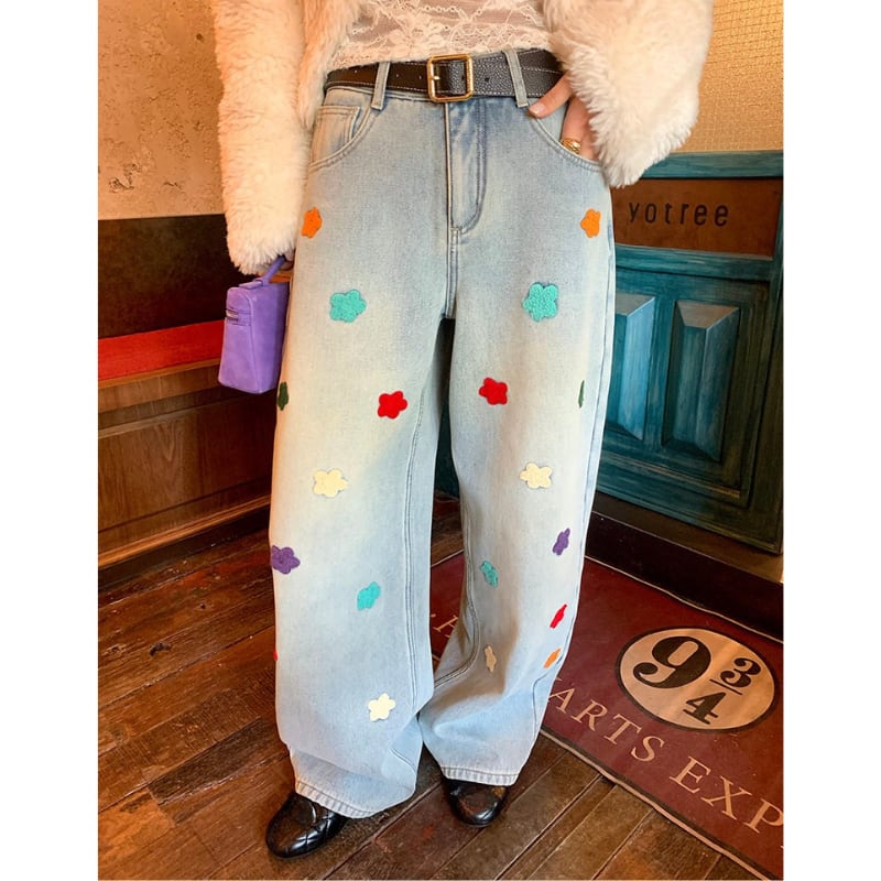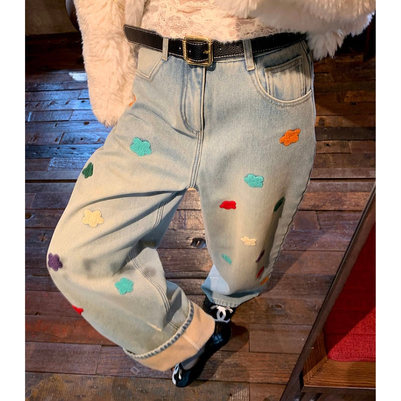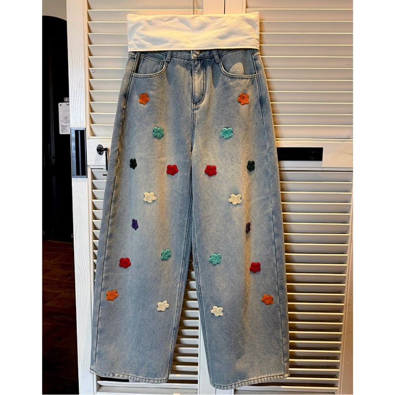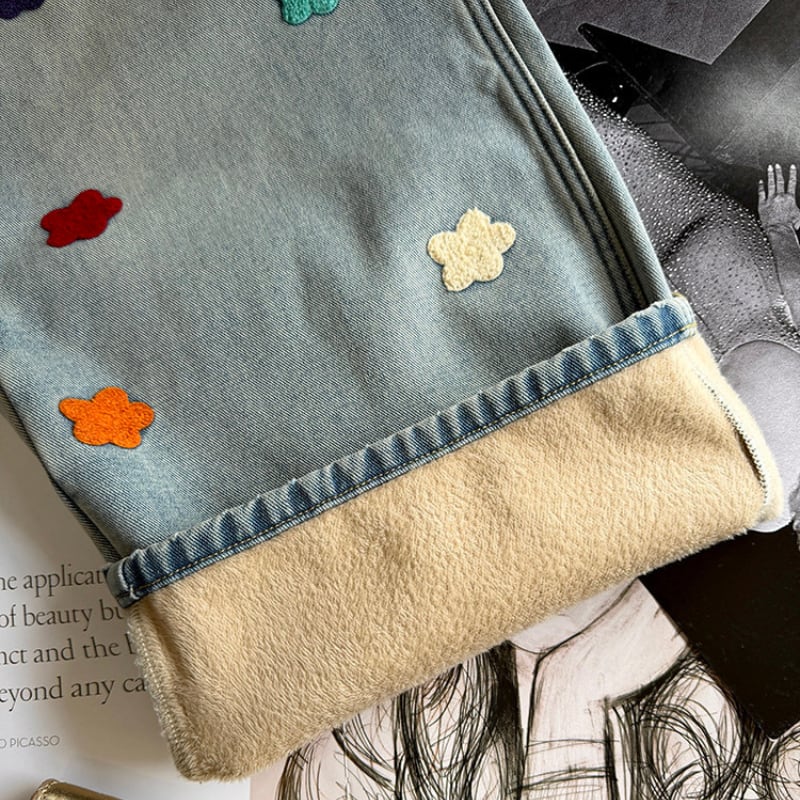 colorful flower embroidery fleece denim pants e1827