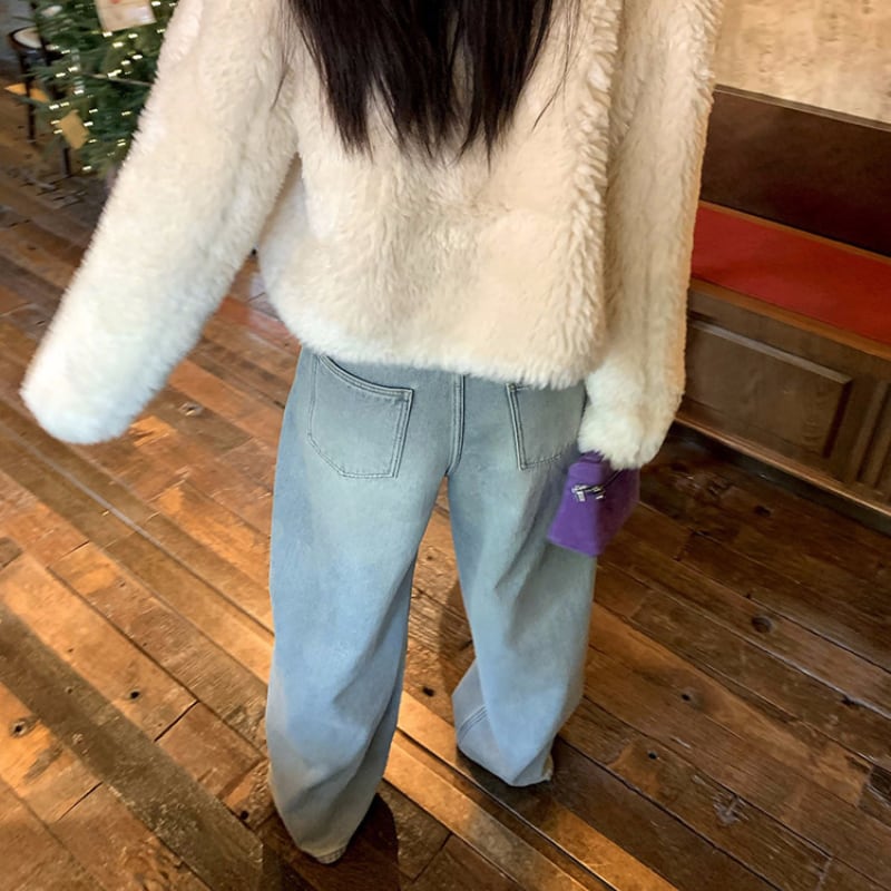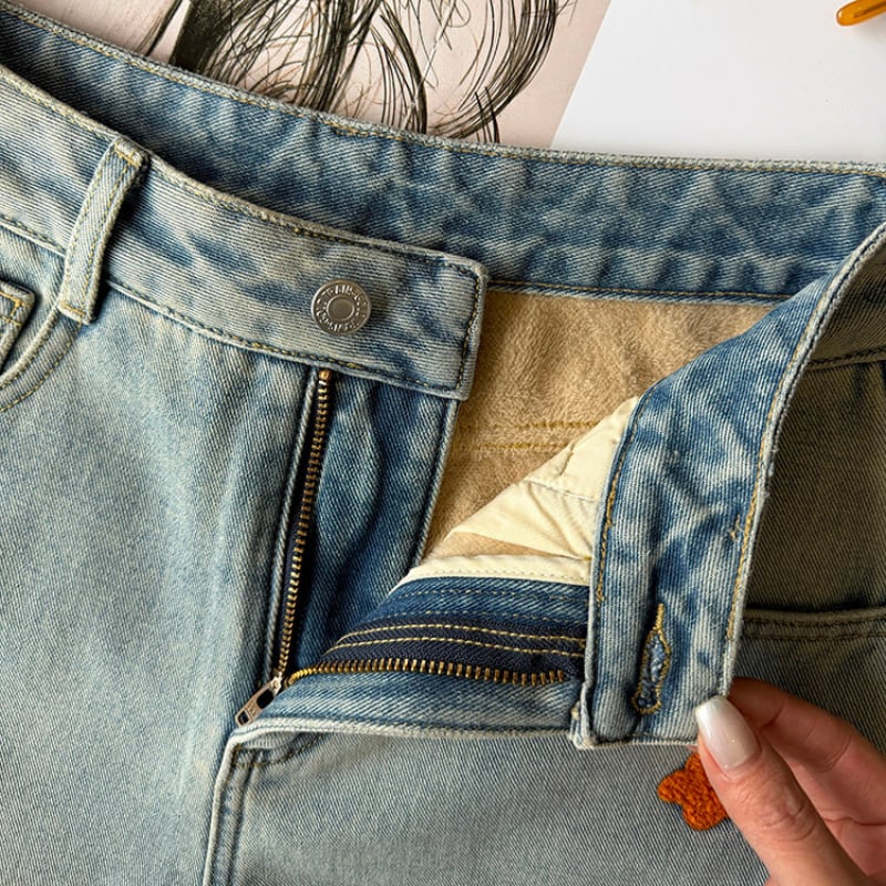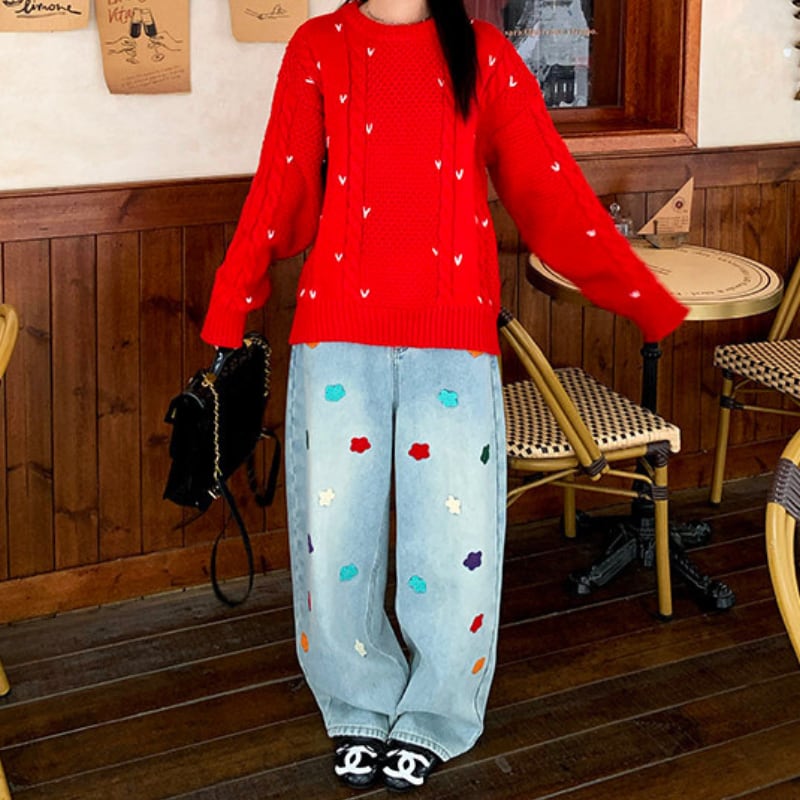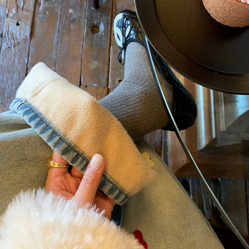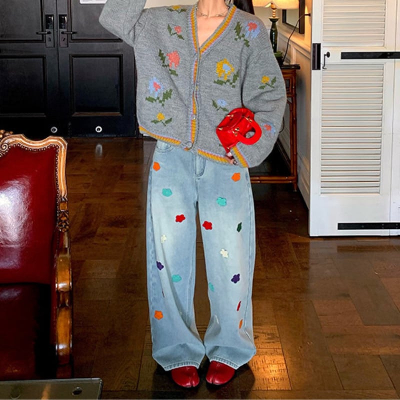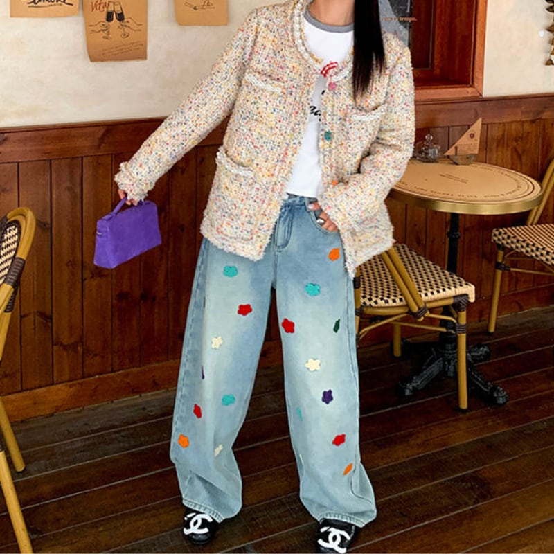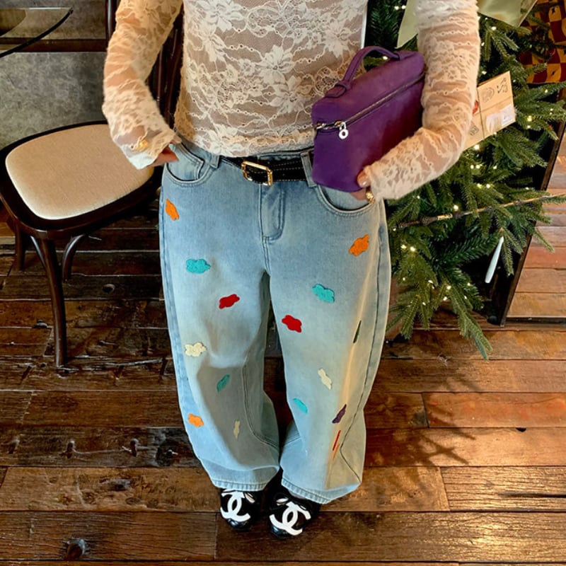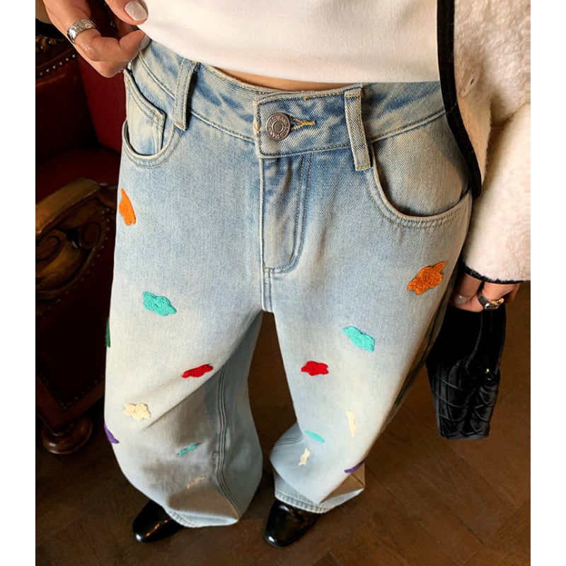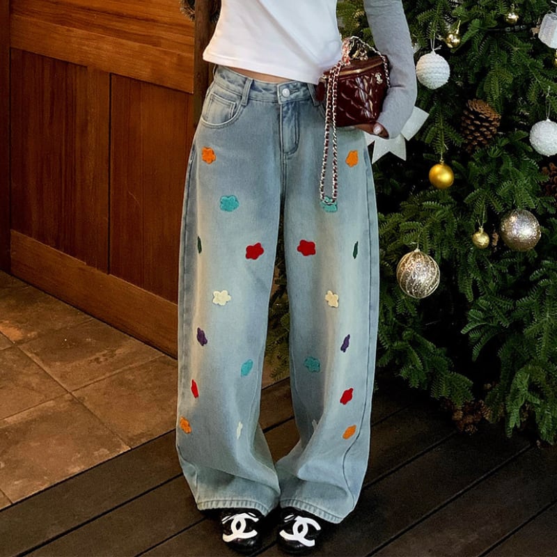 colorful flower embroidery fleece denim pants e1827