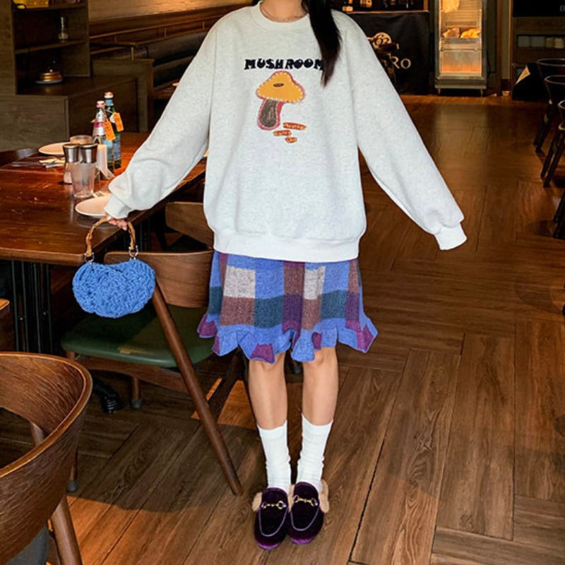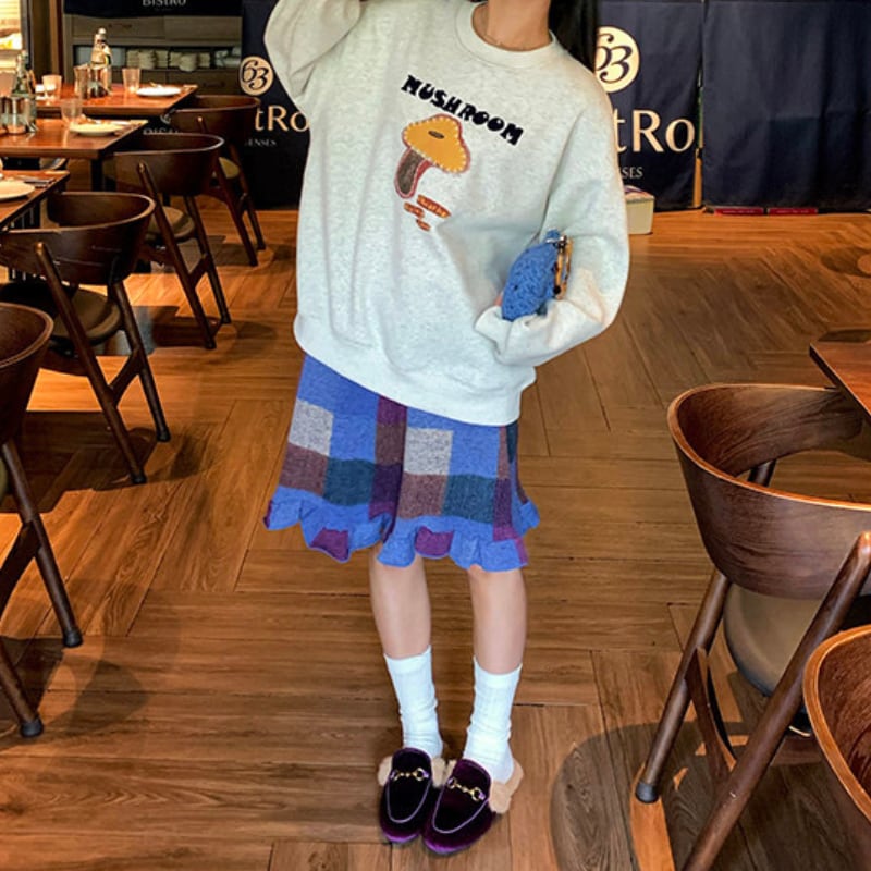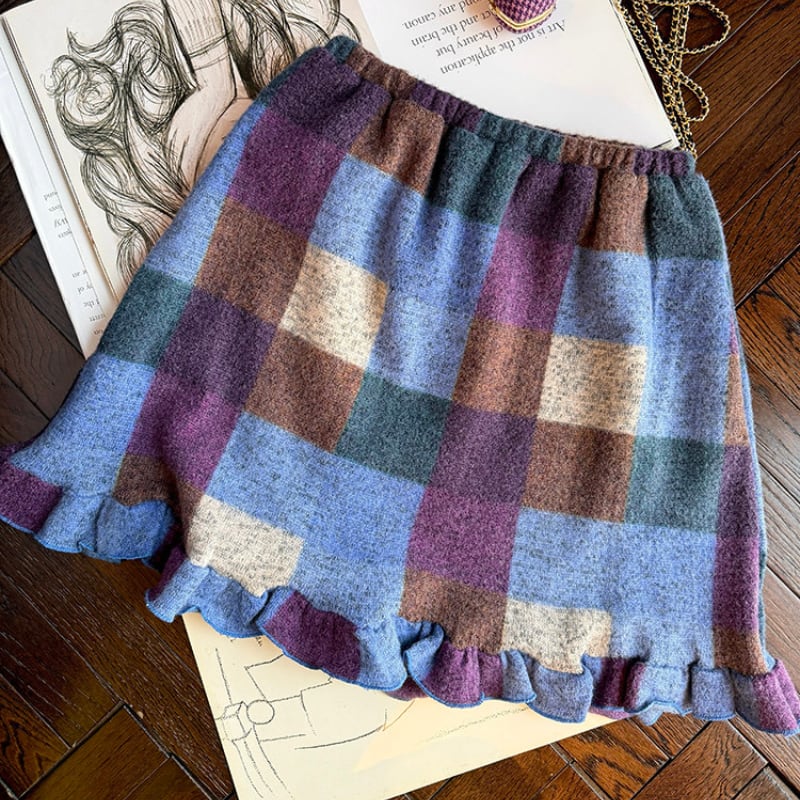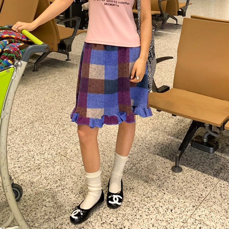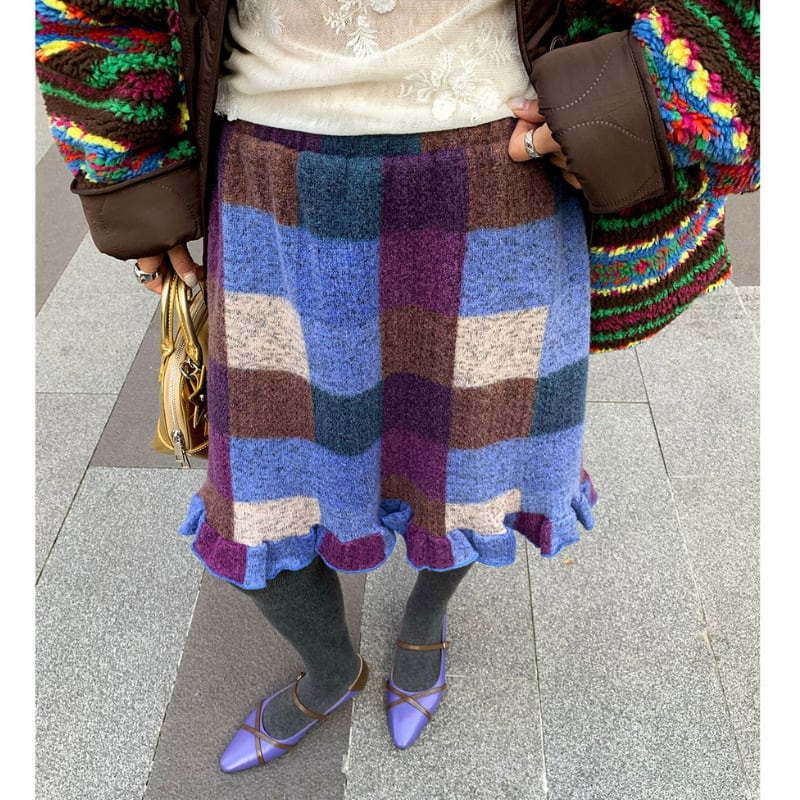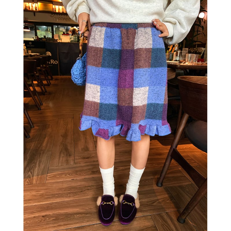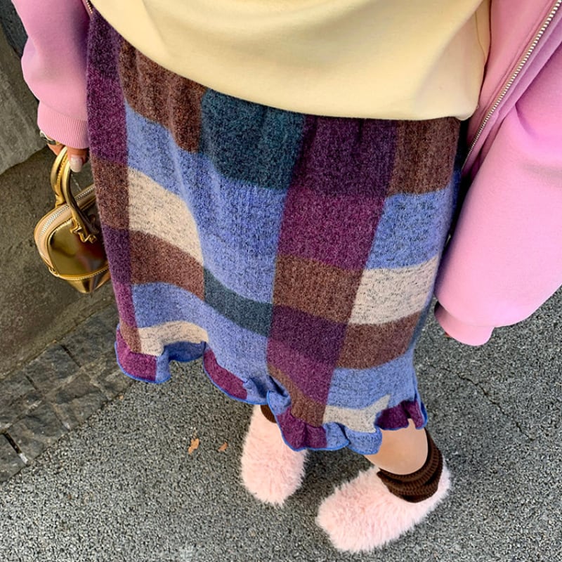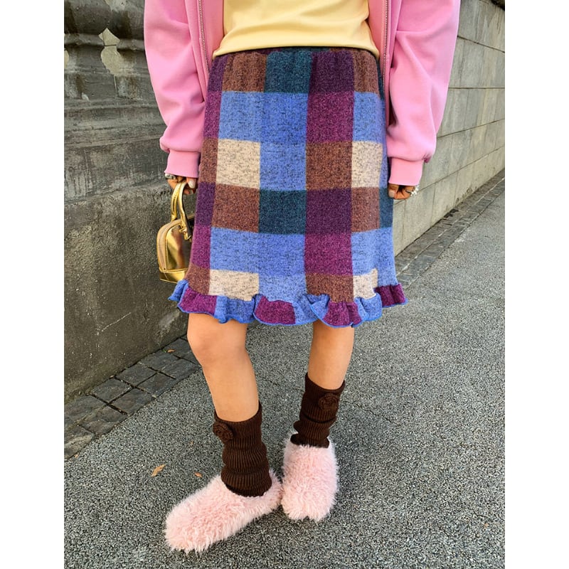 block check frill hem brushed knit skirt e1835