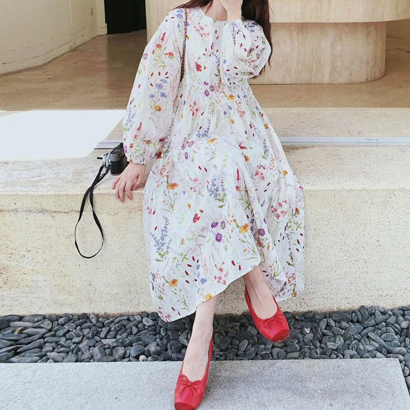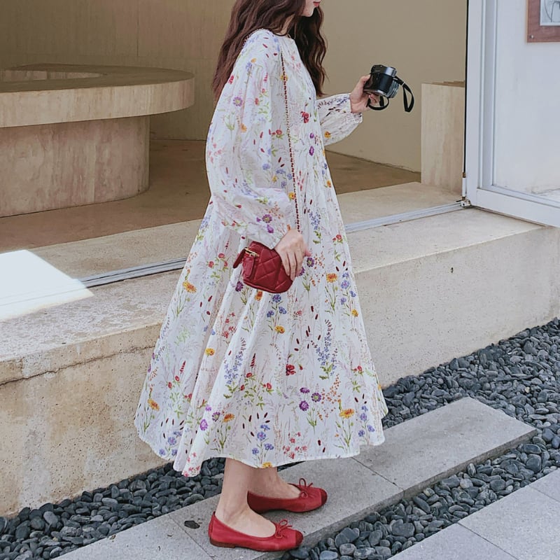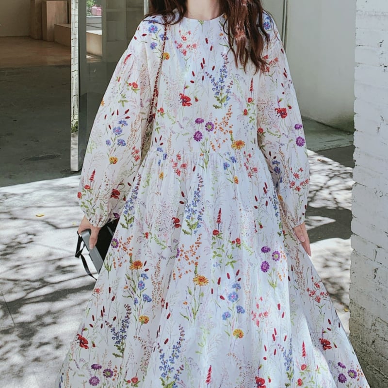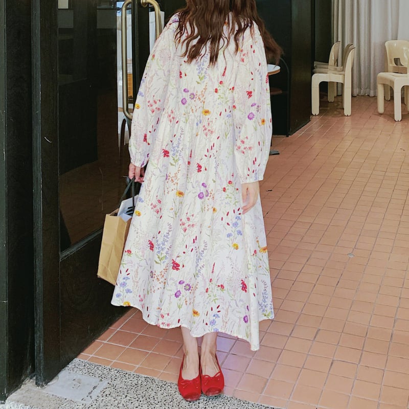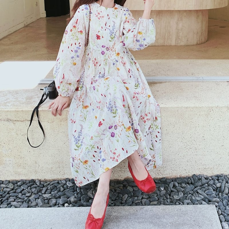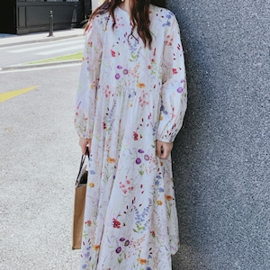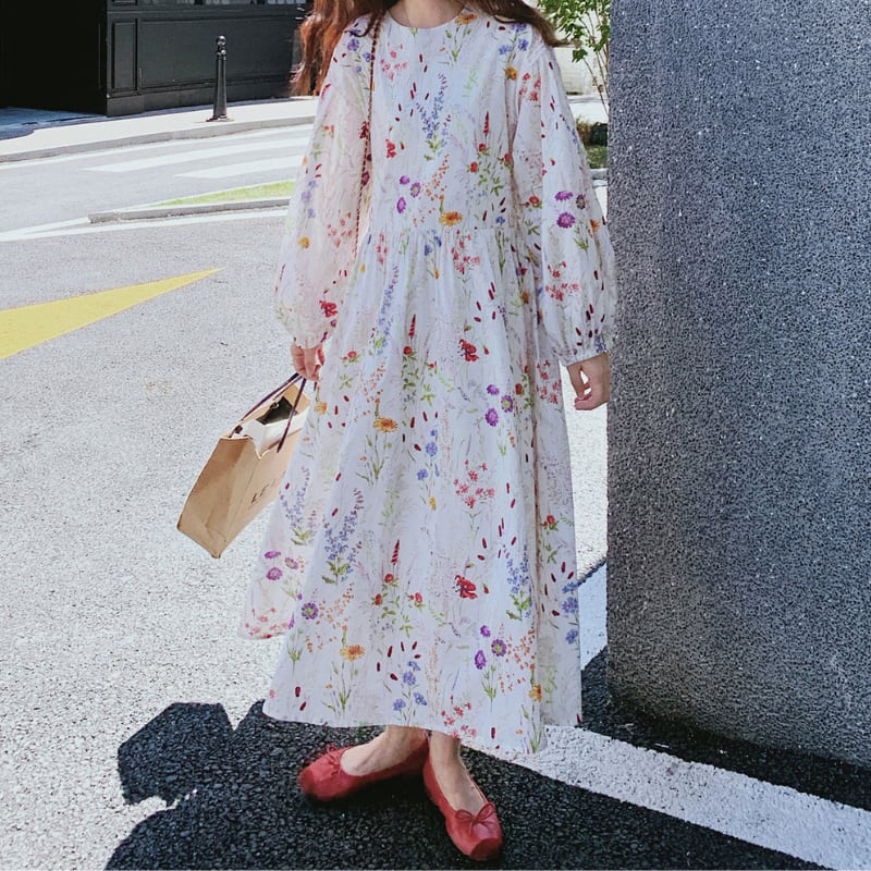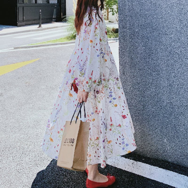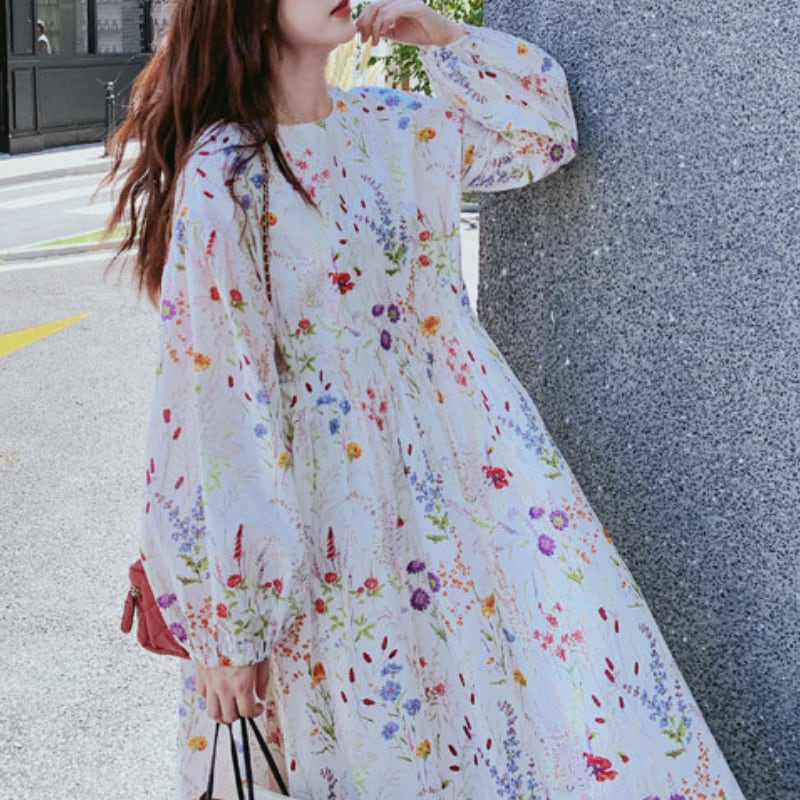 colorful french flower puff sleeve flare dress e1847