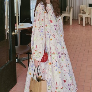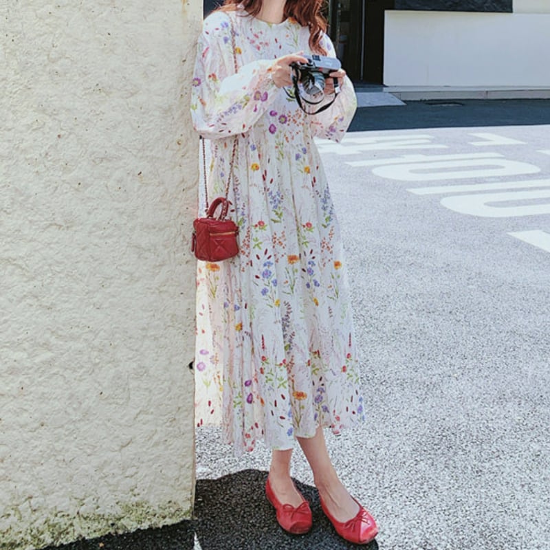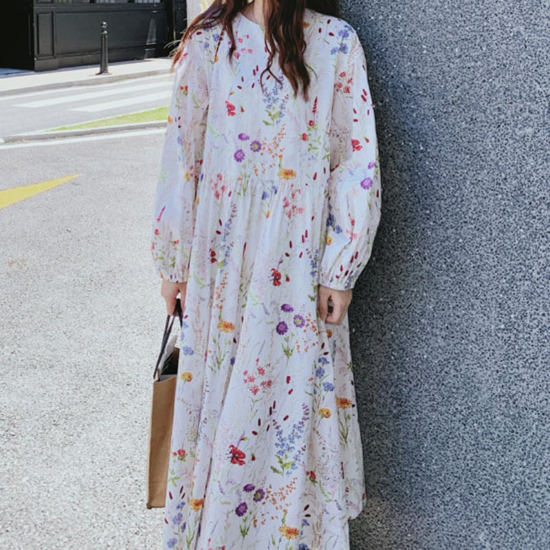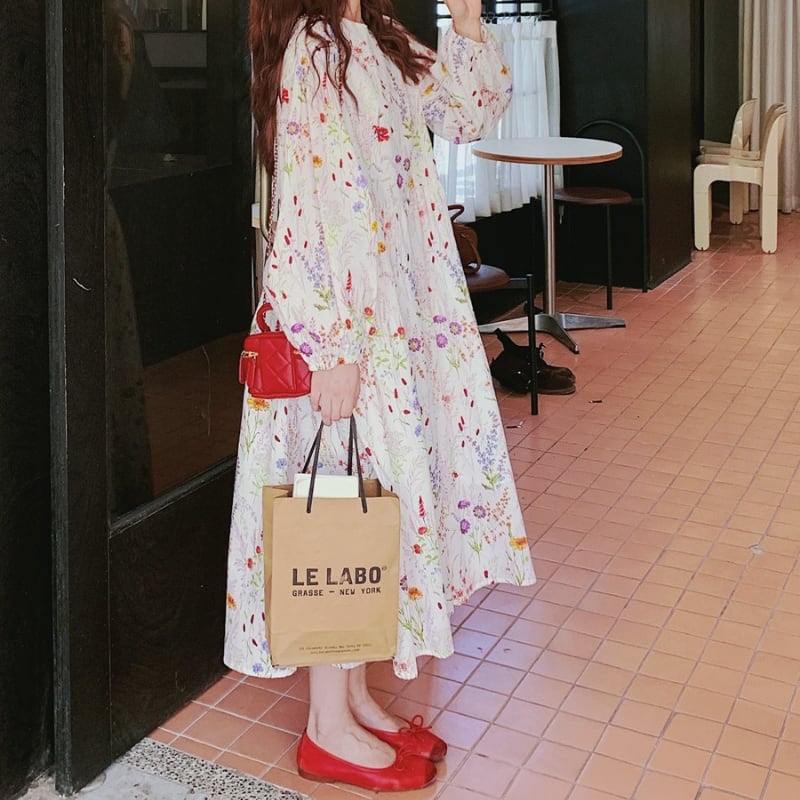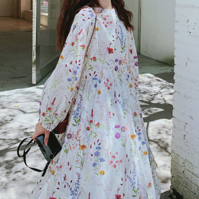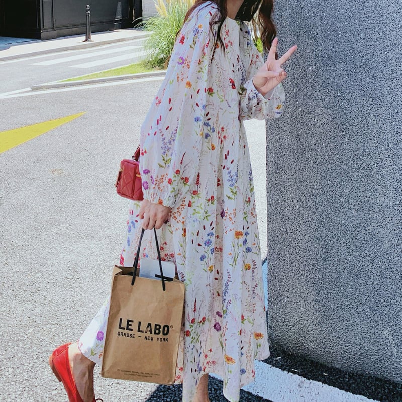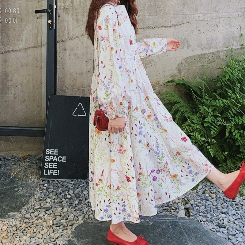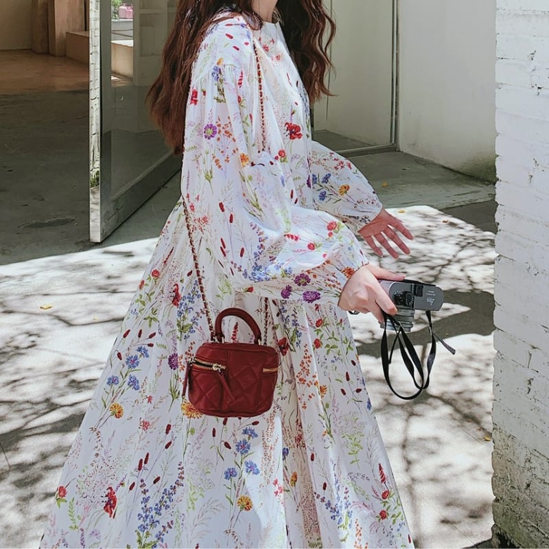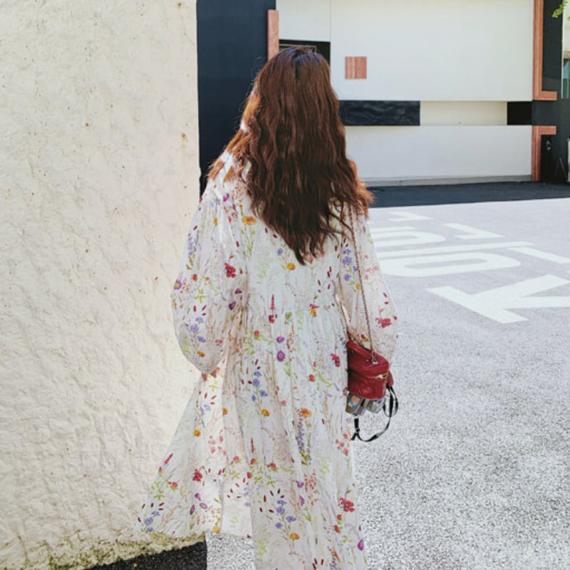 colorful french flower puff sleeve flare dress e1847