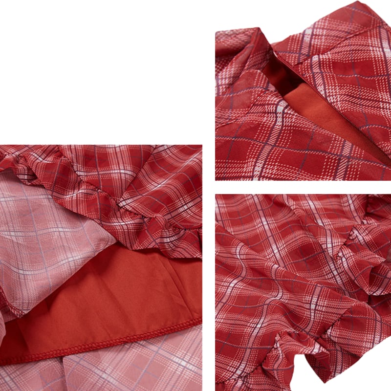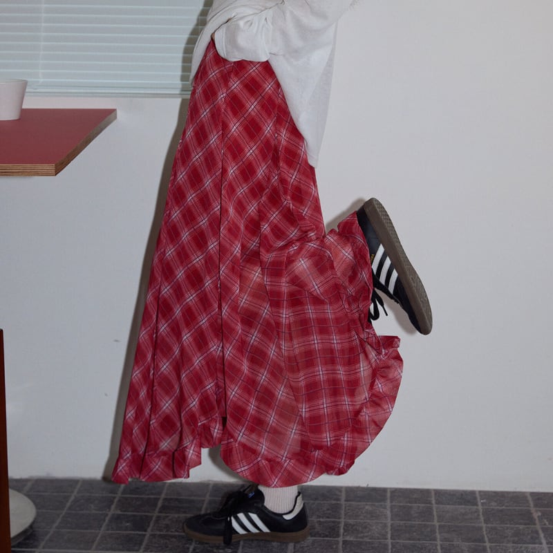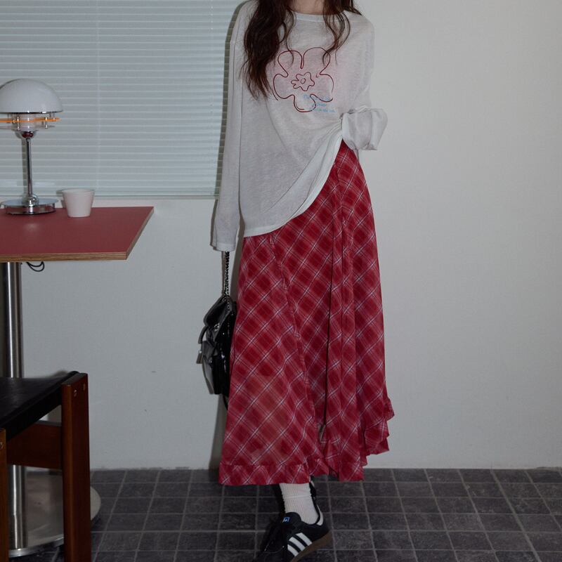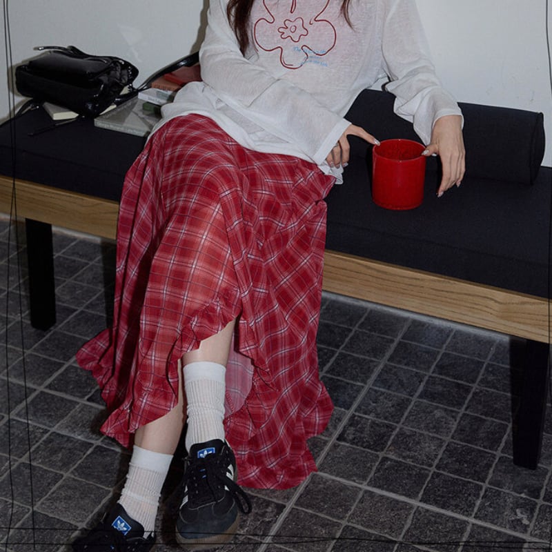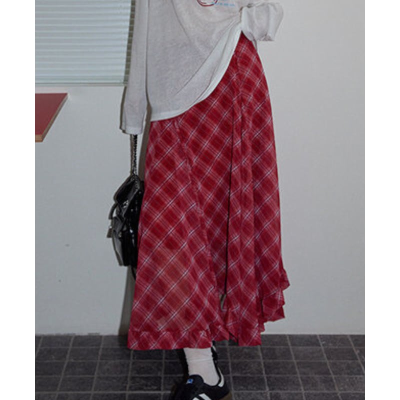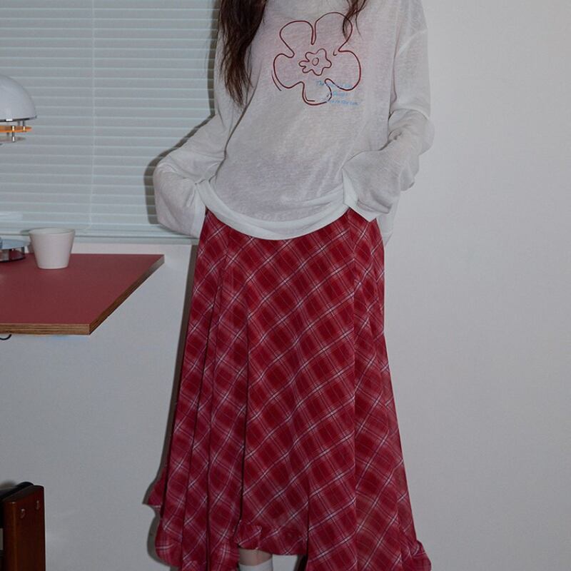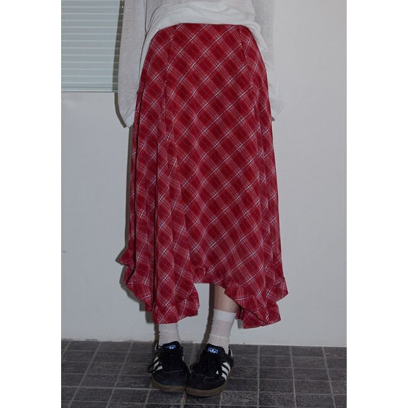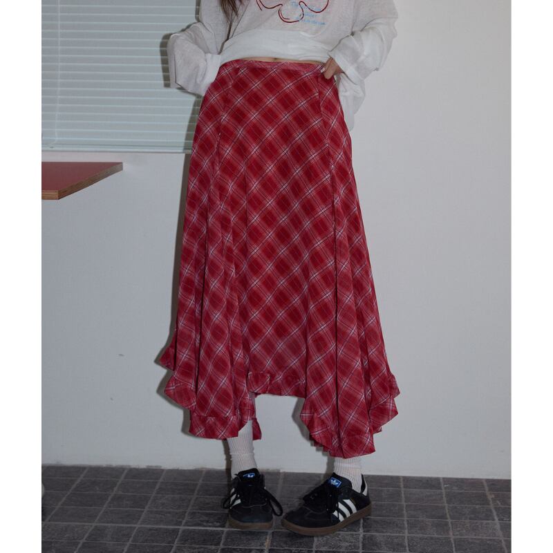 asymmetry retro check frill hem design skirt e1848