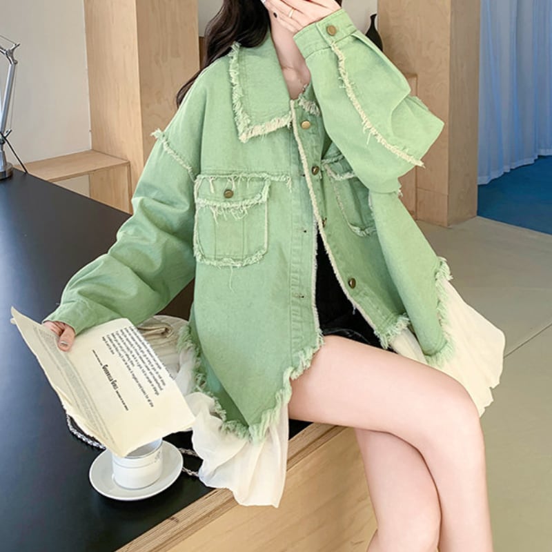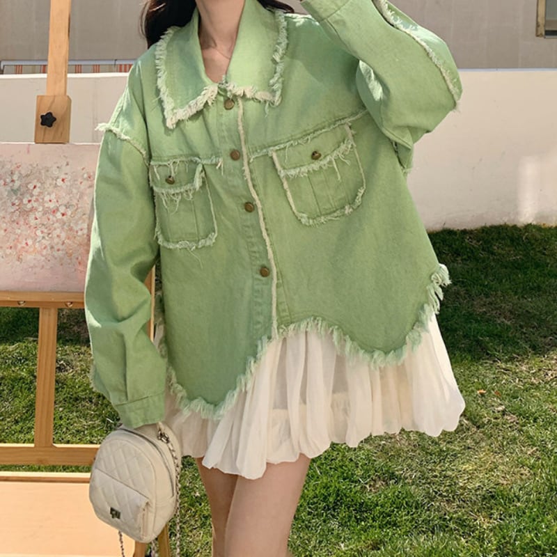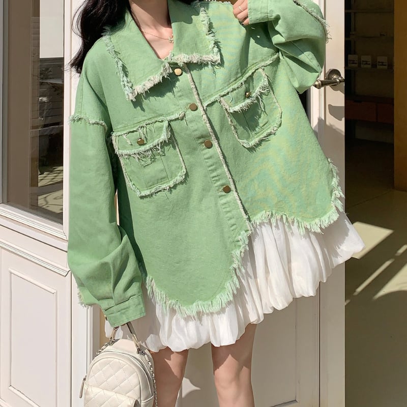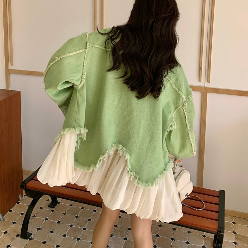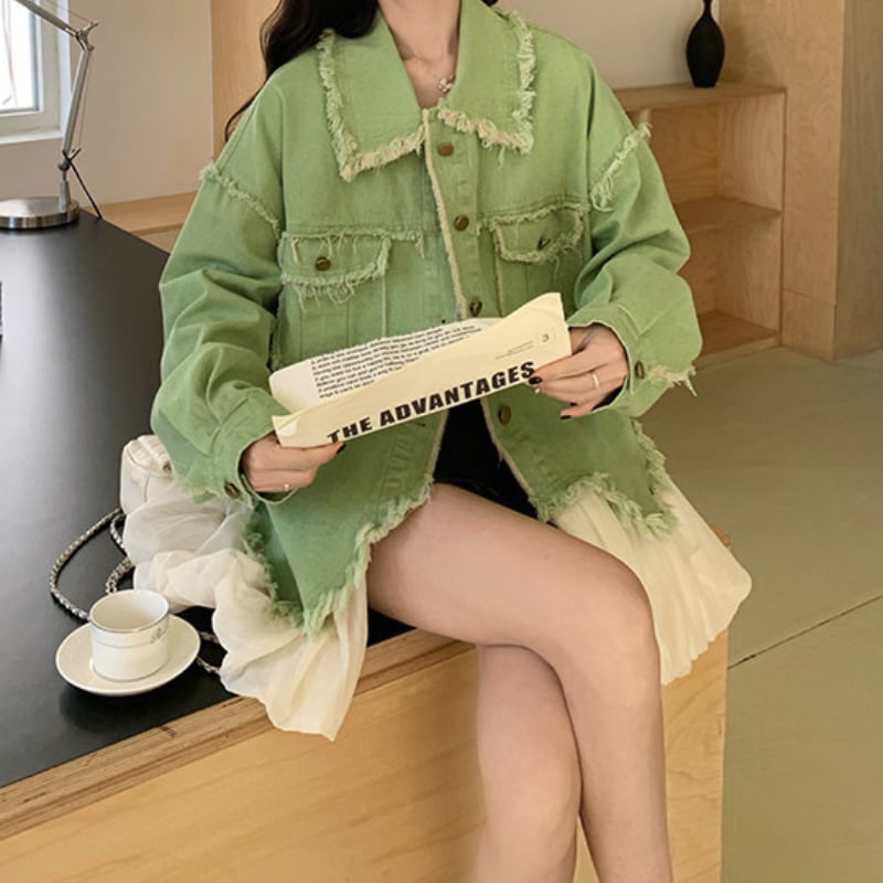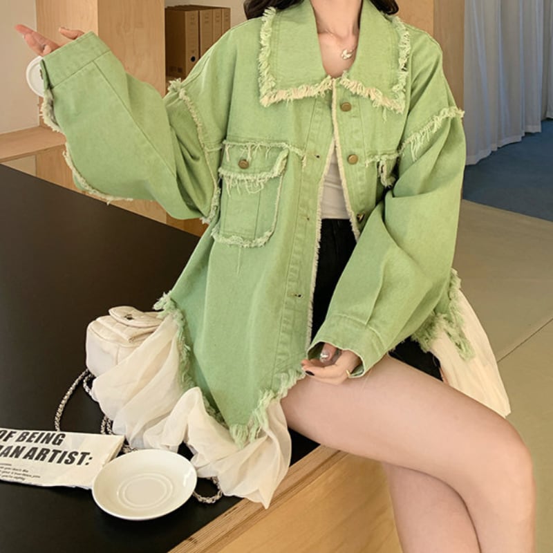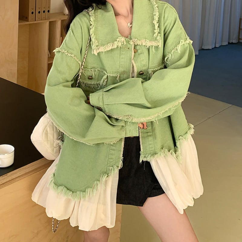melon fringe sheer balloon hem denim jacket e1856