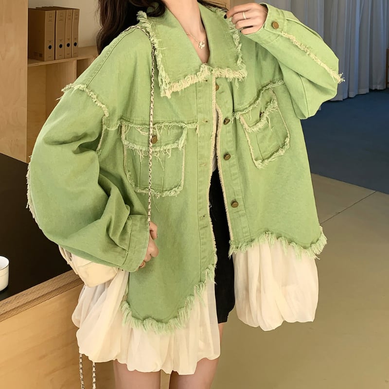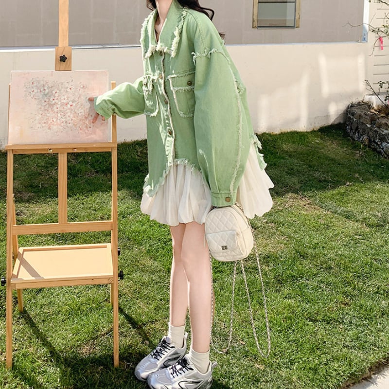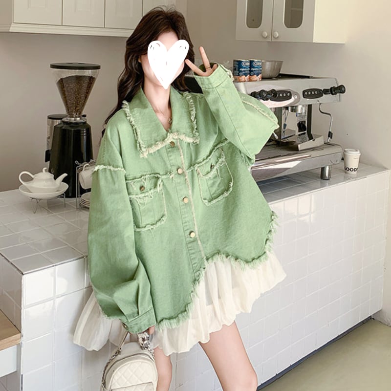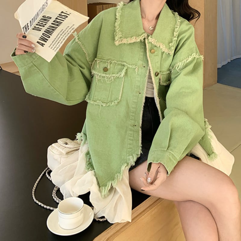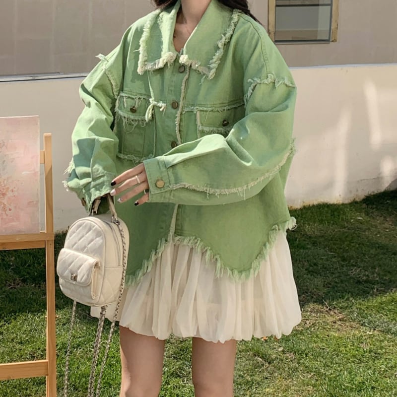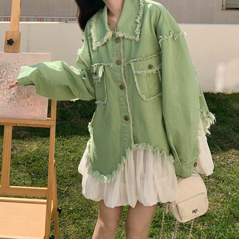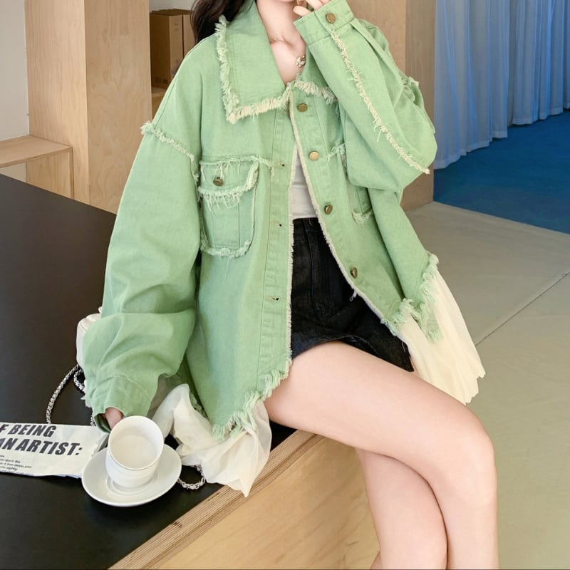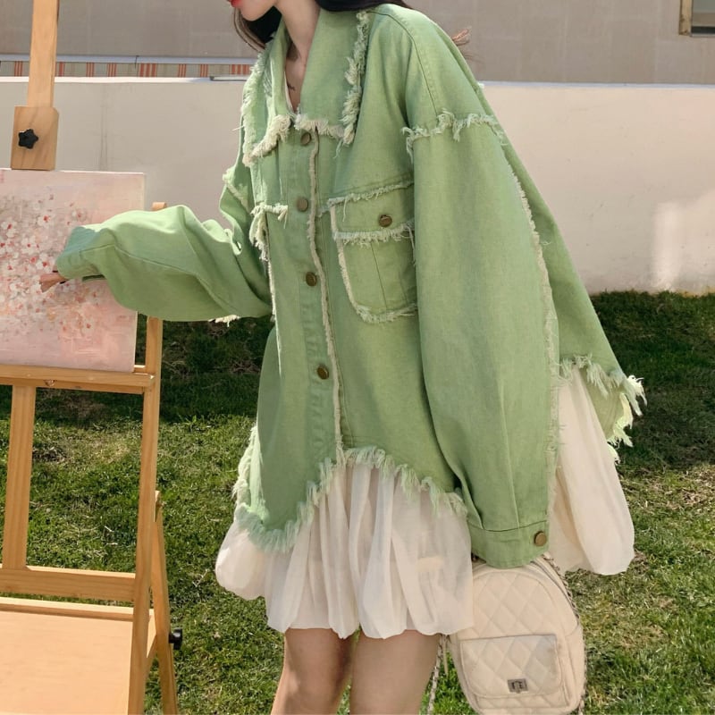 melon fringe sheer balloon hem denim jacket e1856
