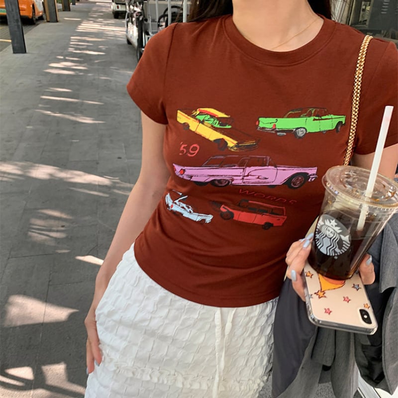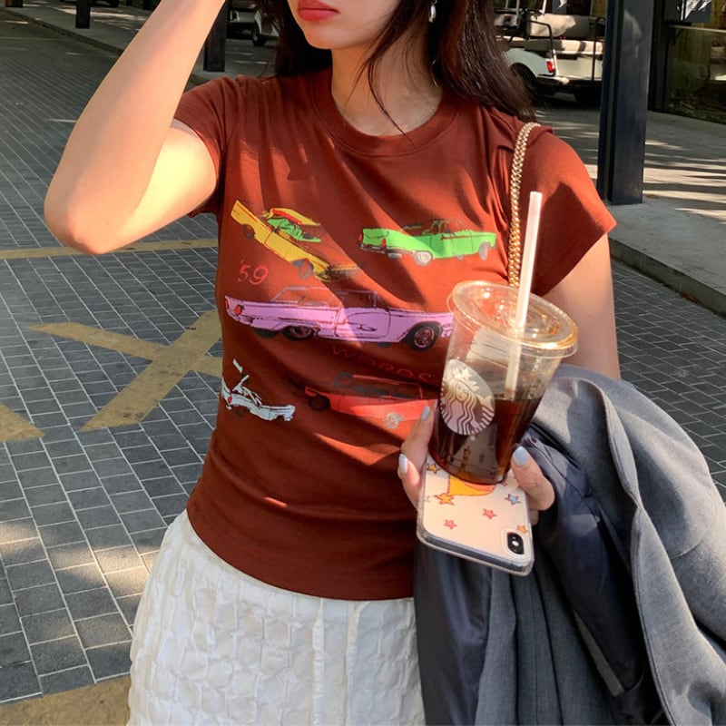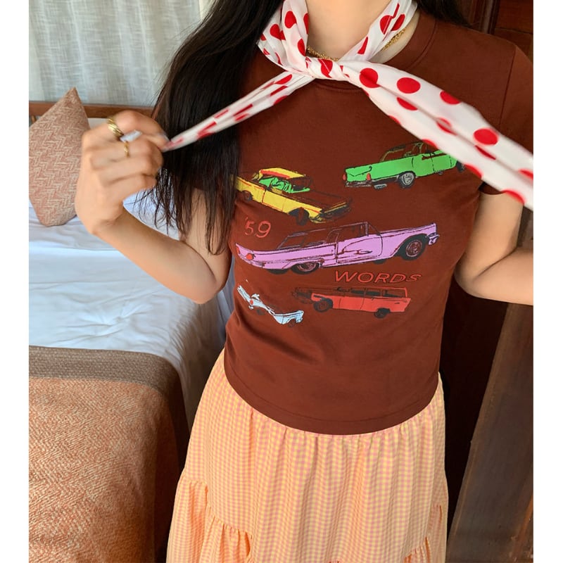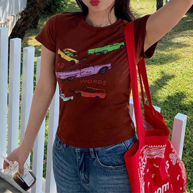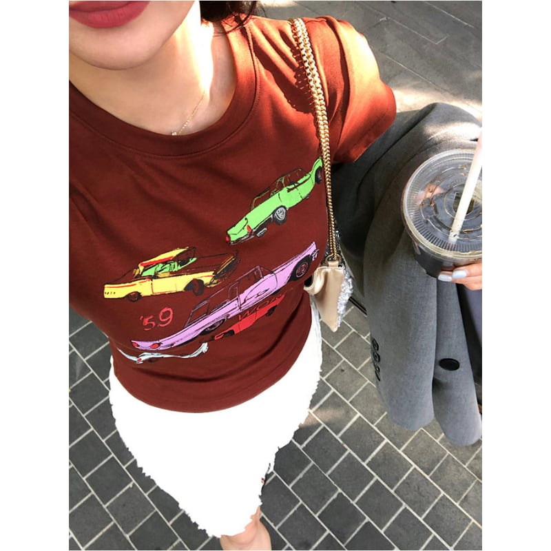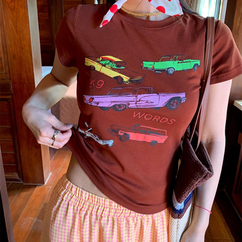 colorful classic car print chocolate tee e1878