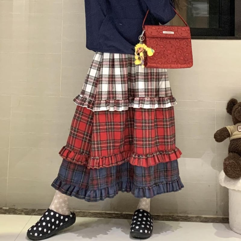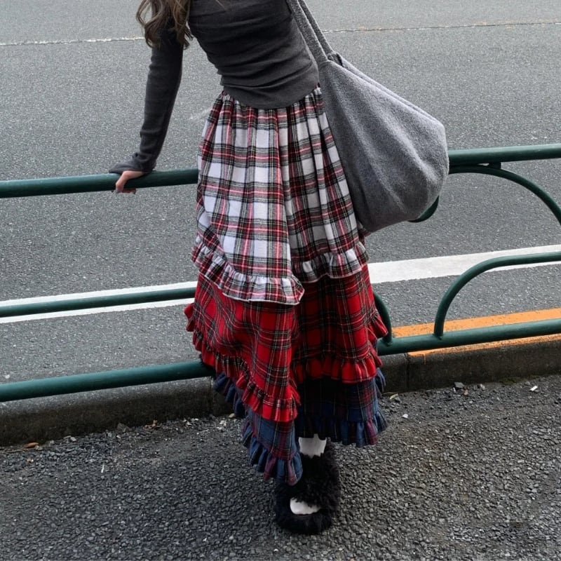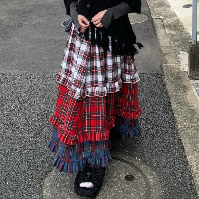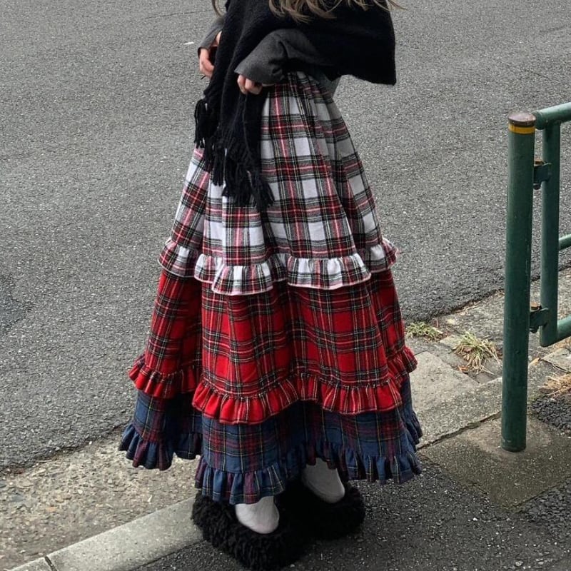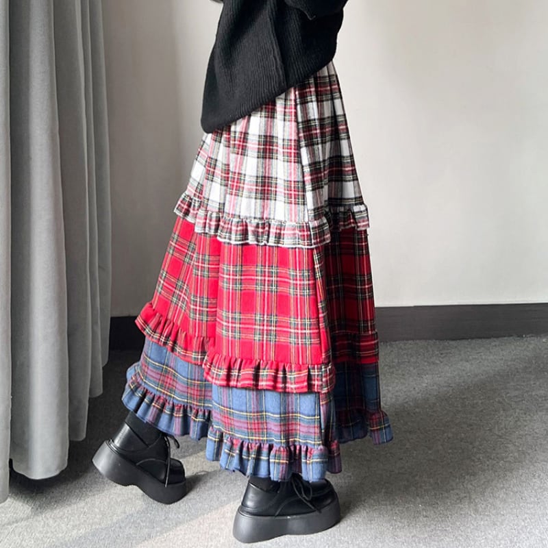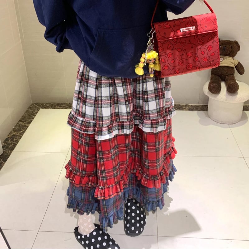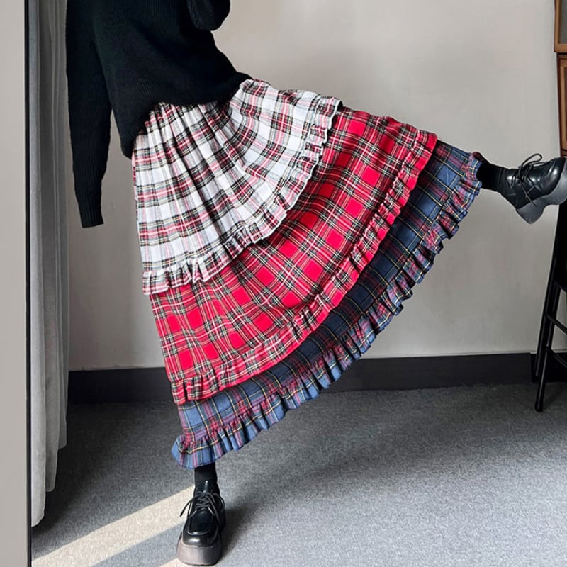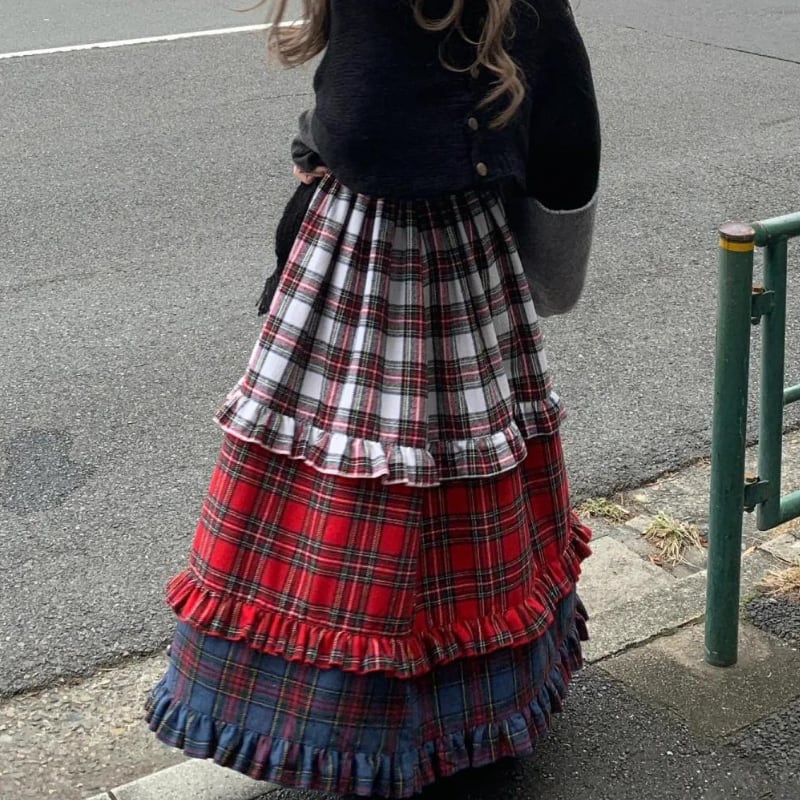 【即納】american retro check tiered cake skirt e1270