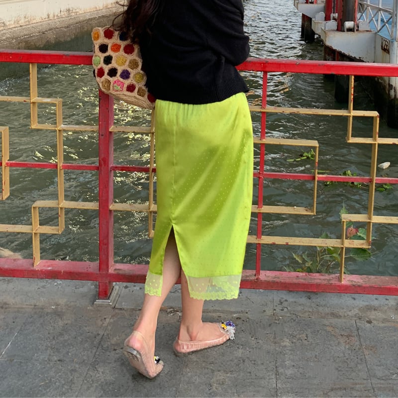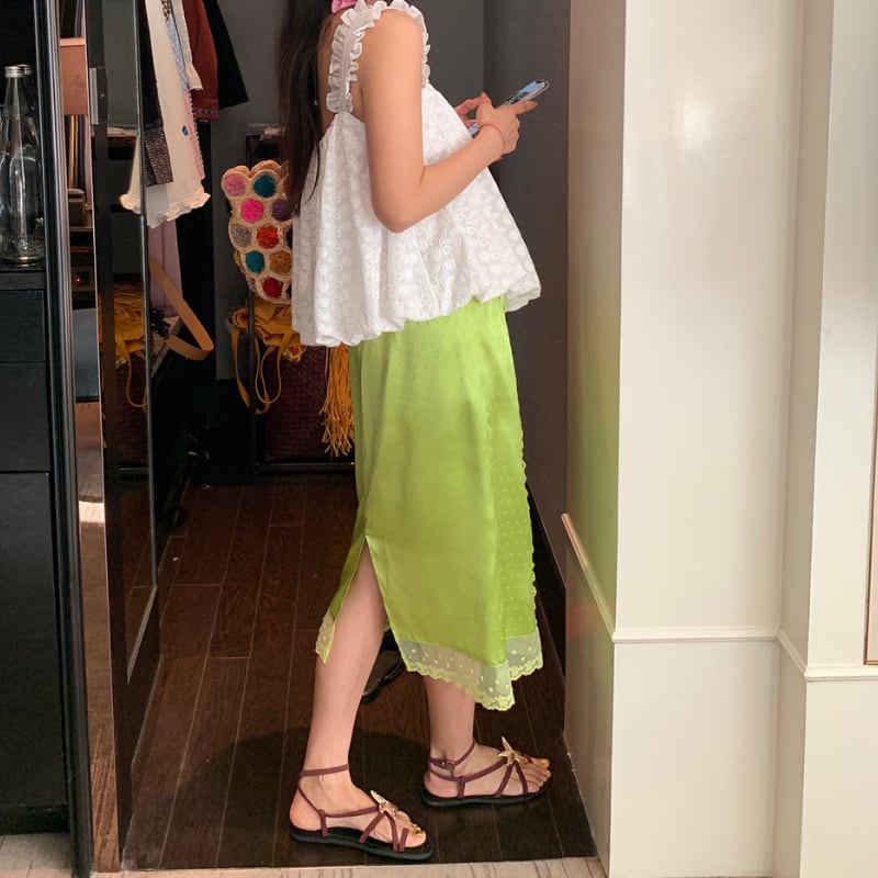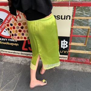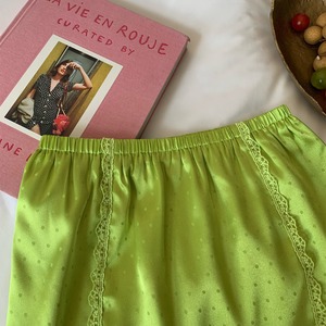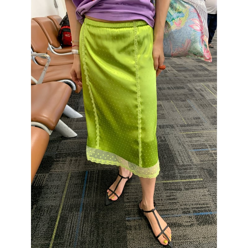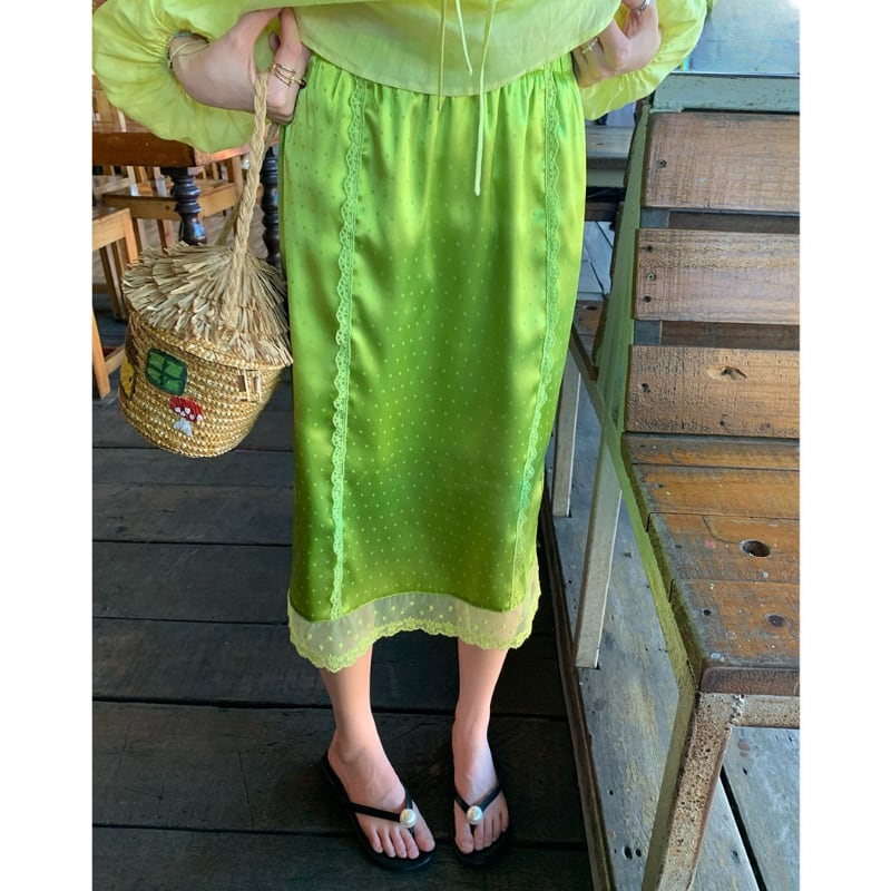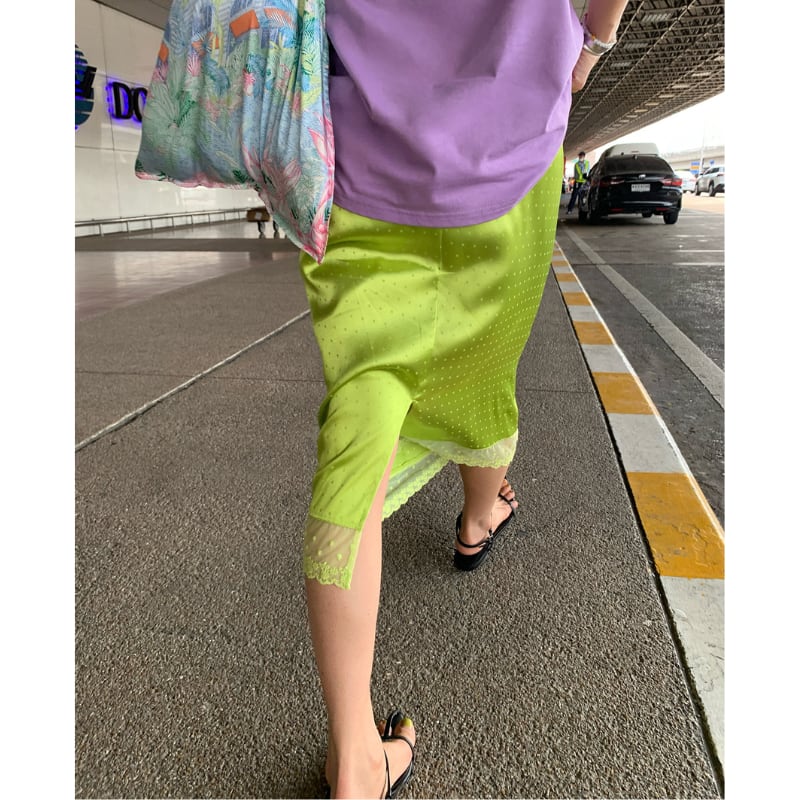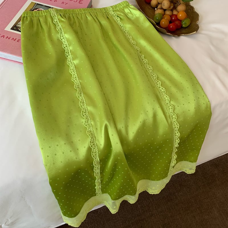 fresh kiwi satin dot lace trim back slit skirt e1902