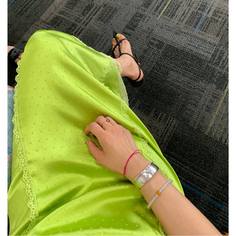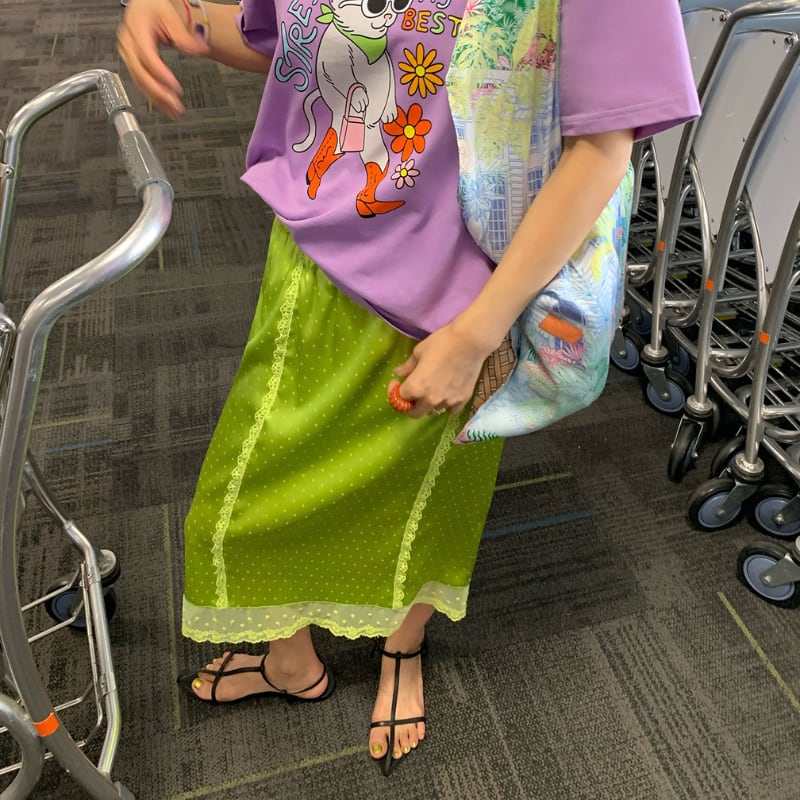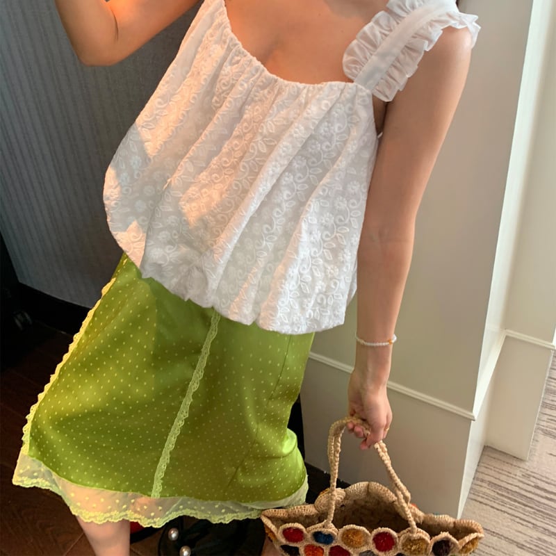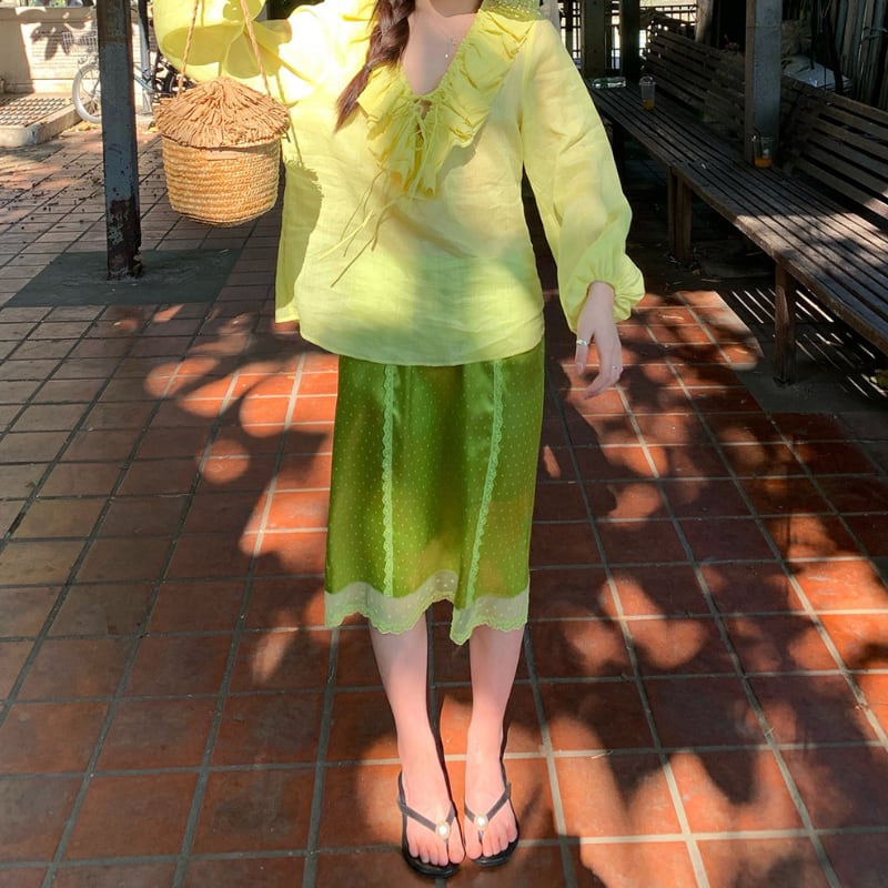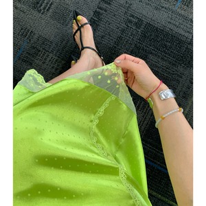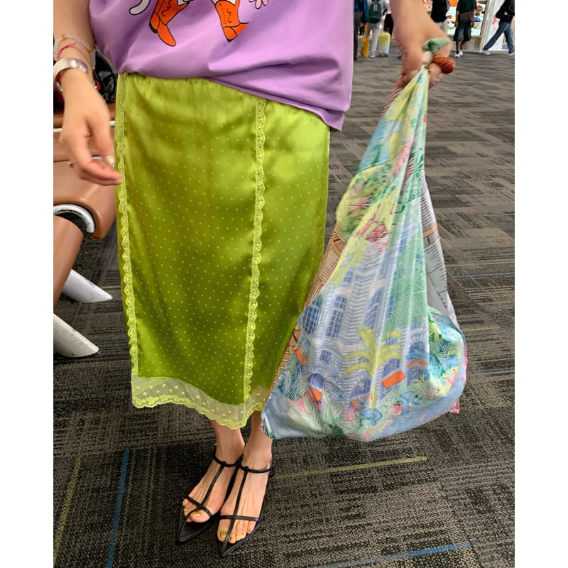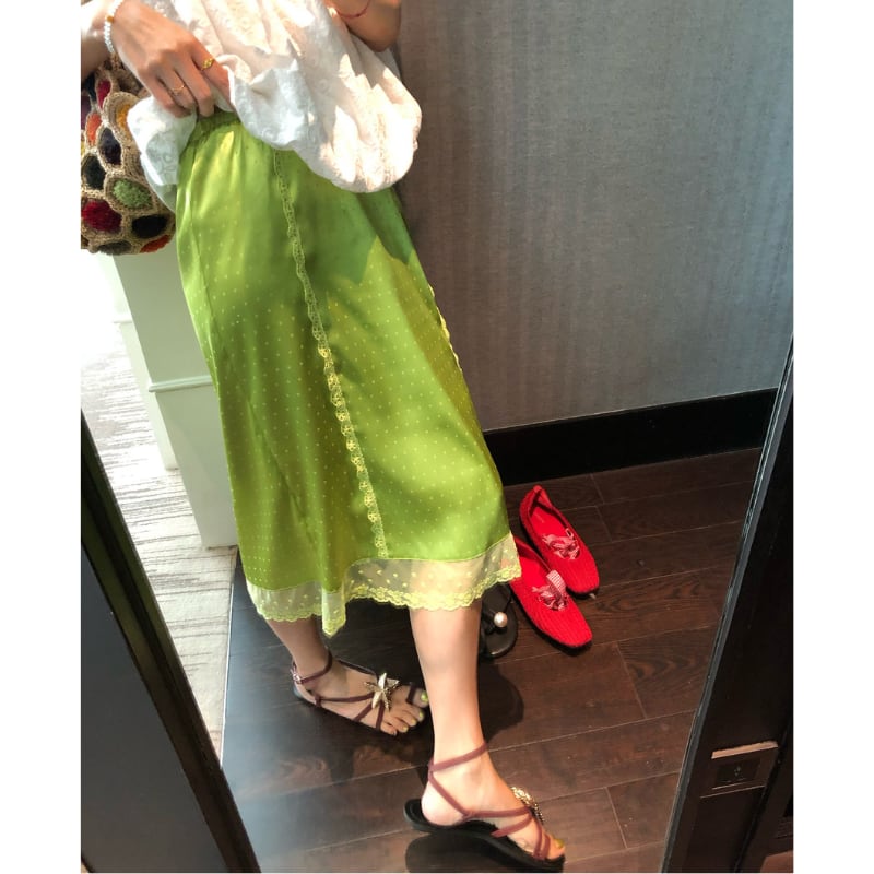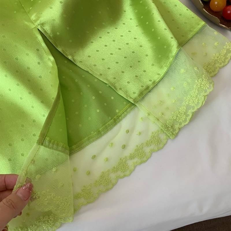 fresh kiwi satin dot lace trim back slit skirt e1902