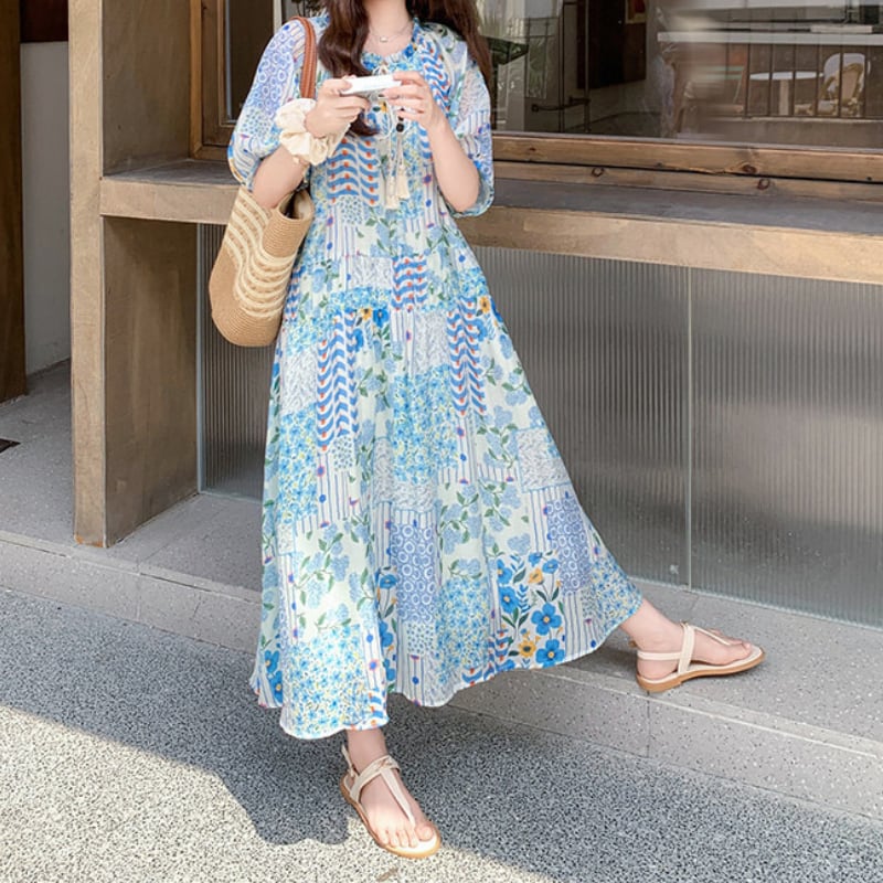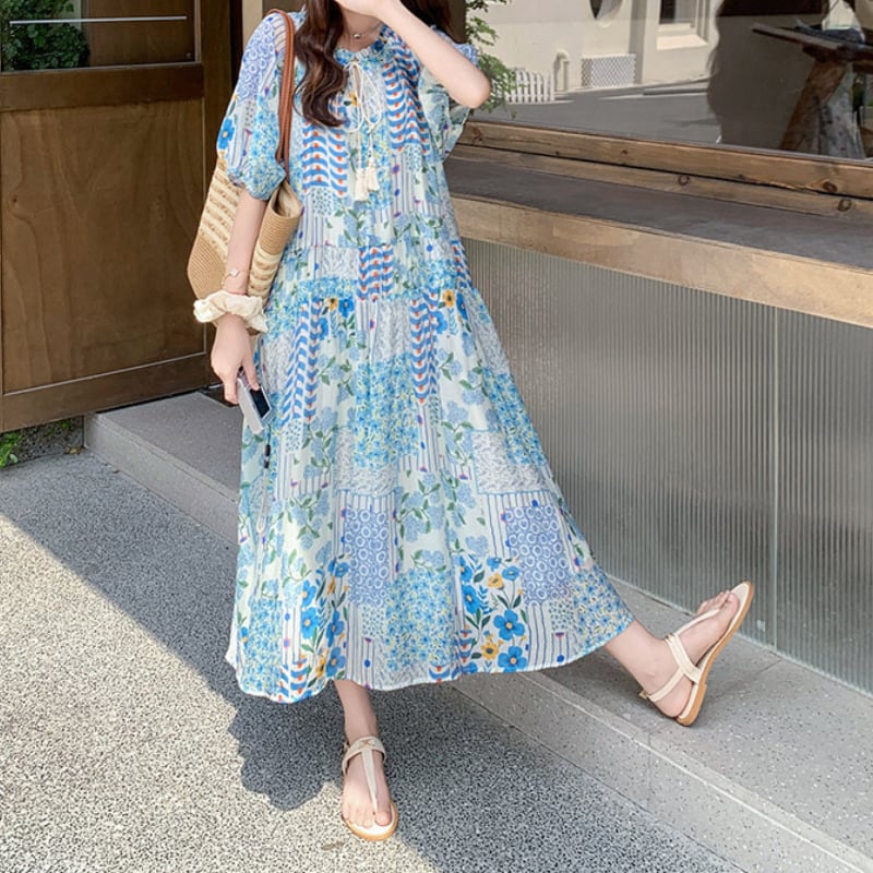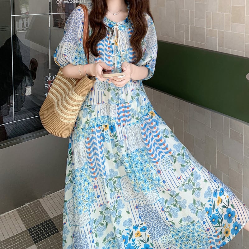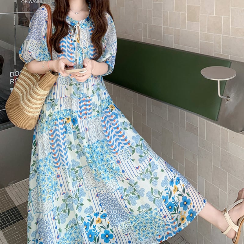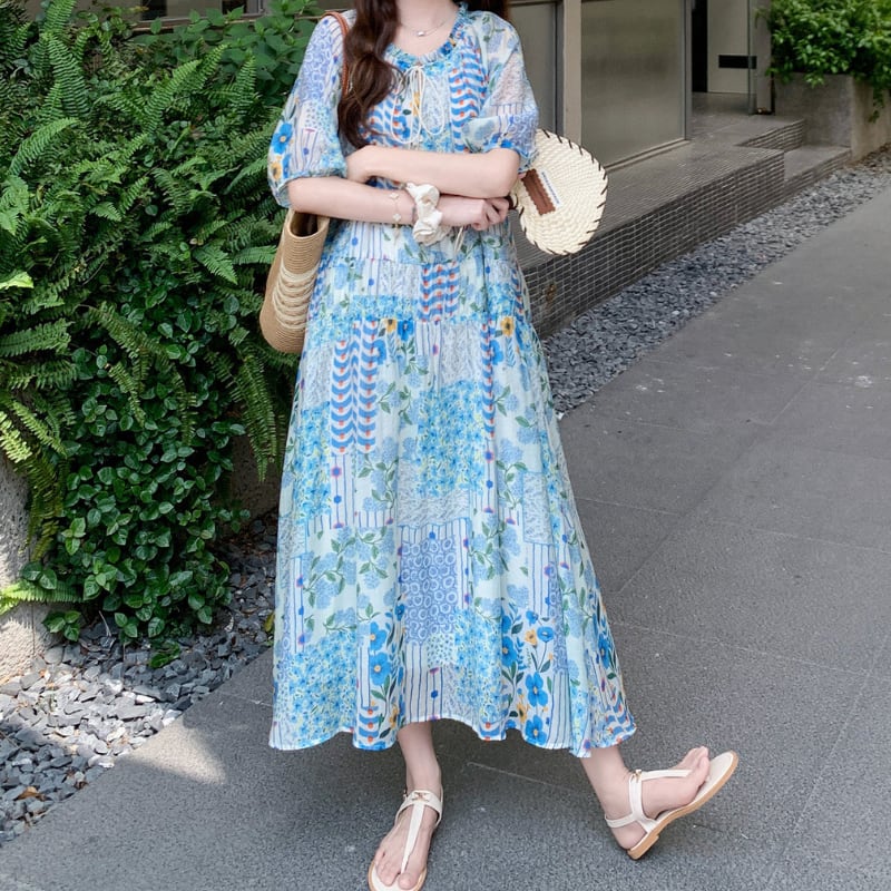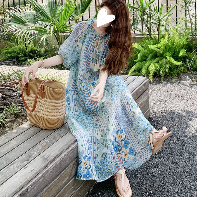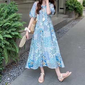 happy blue resort flower puff sleeve dress e1911