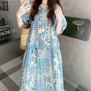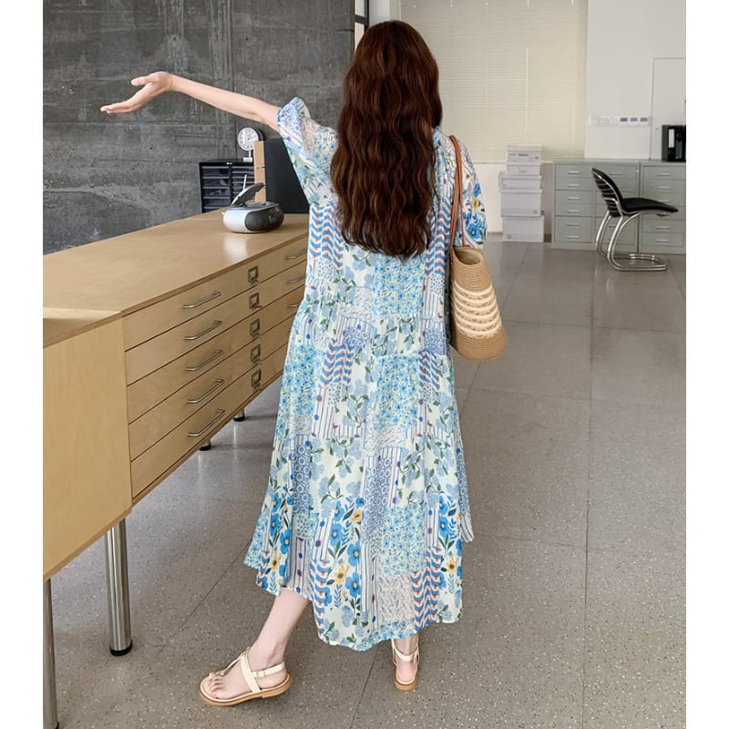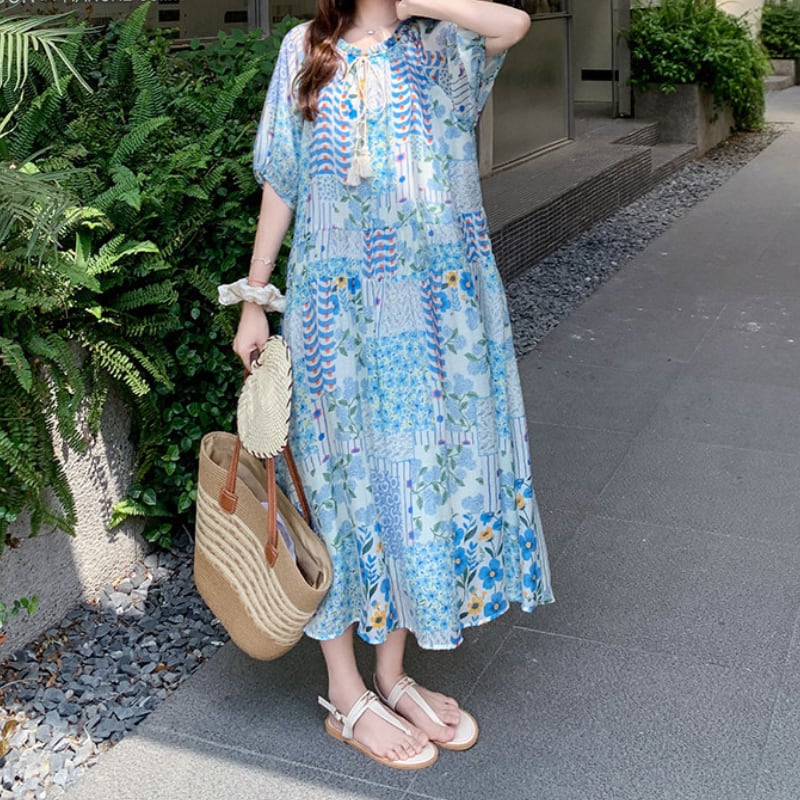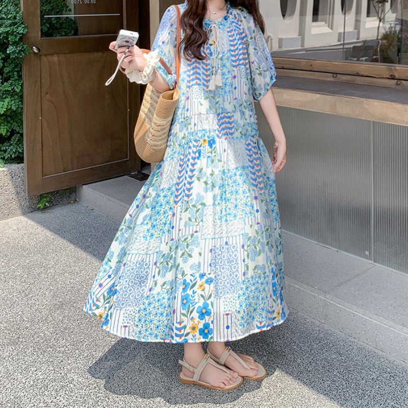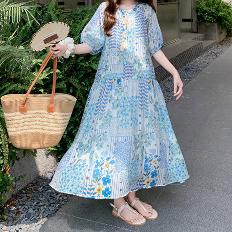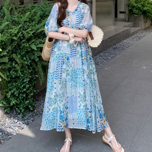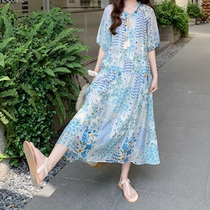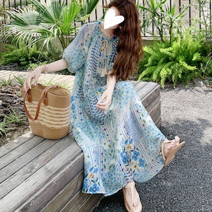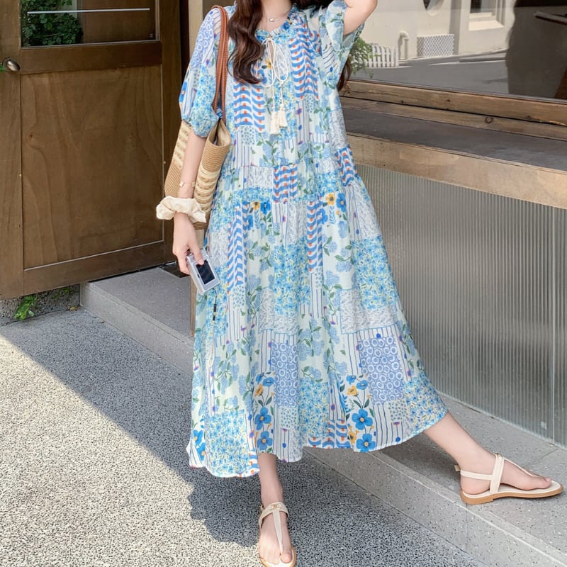 happy blue resort flower puff sleeve dress e1911