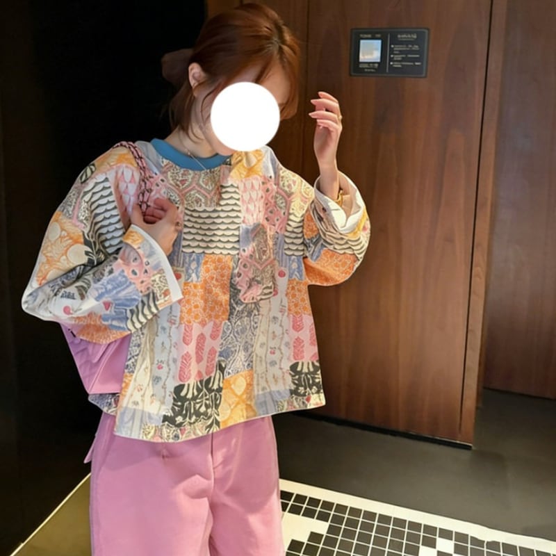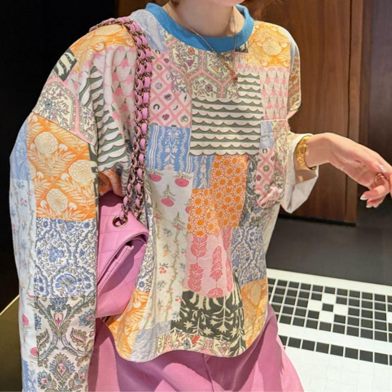 retro color block flower patchwork design tee e1912