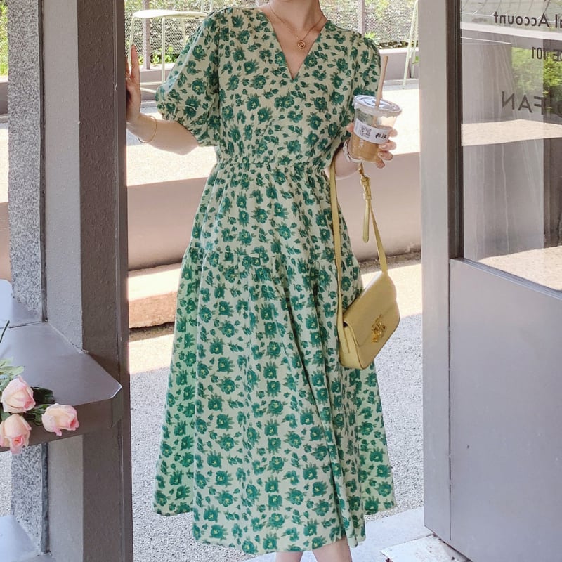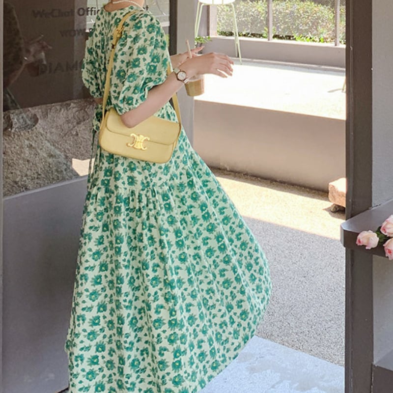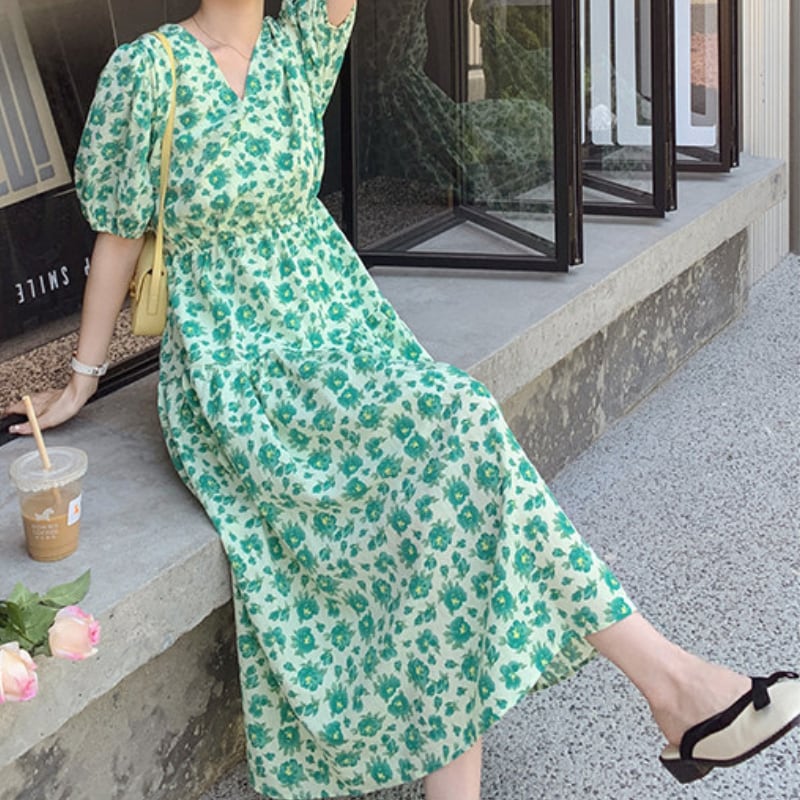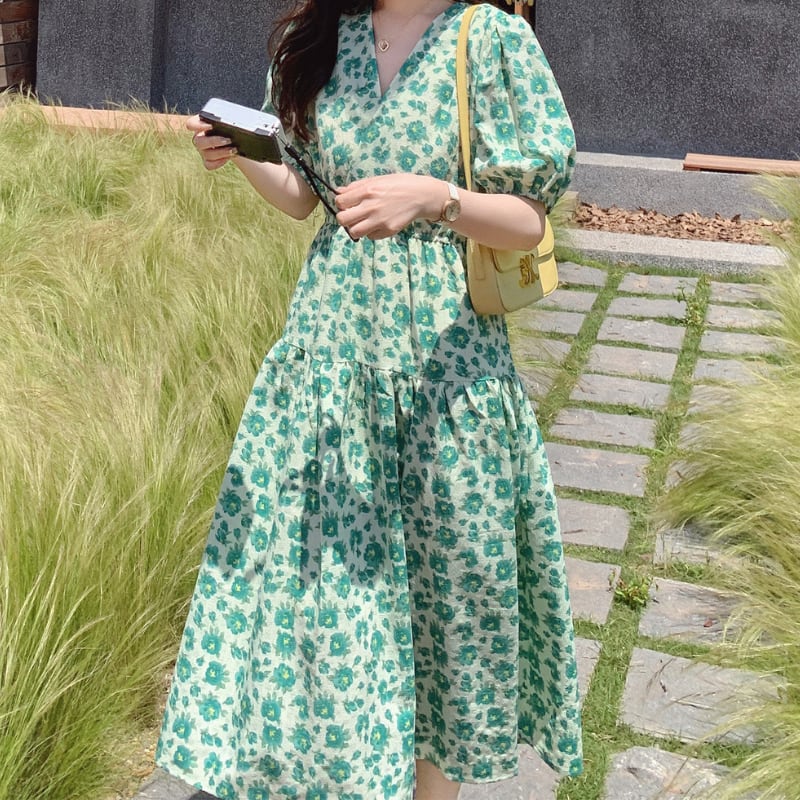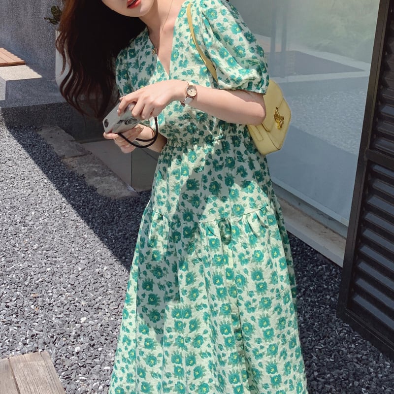 wonder green flower garden puff sleeve dress e1917
