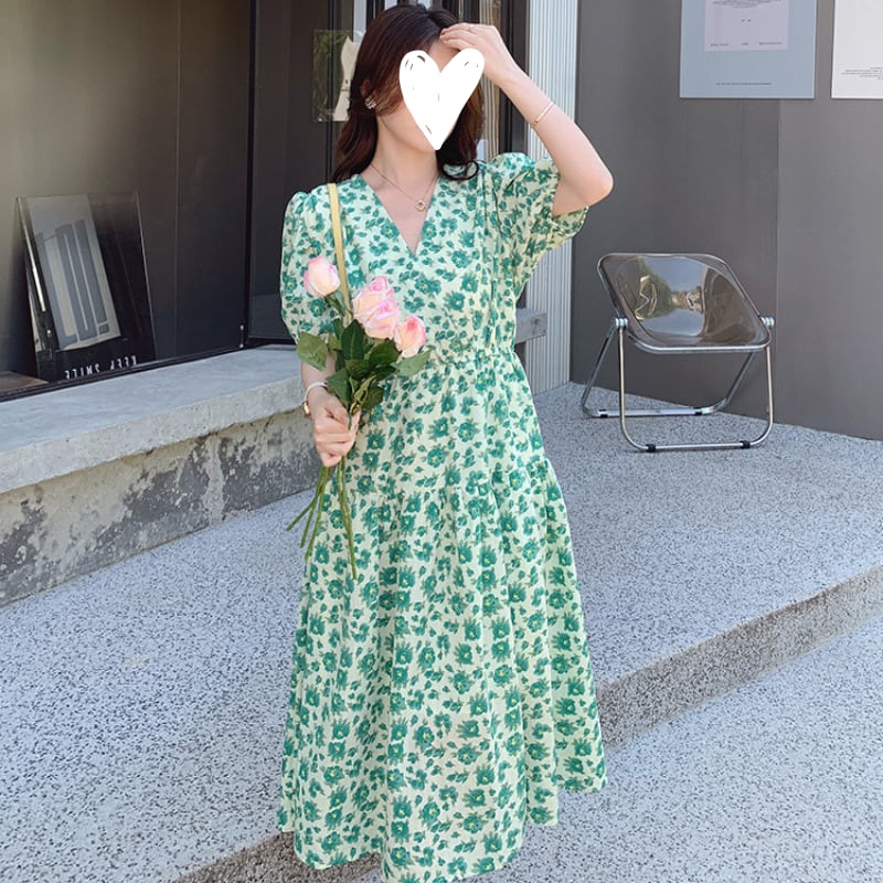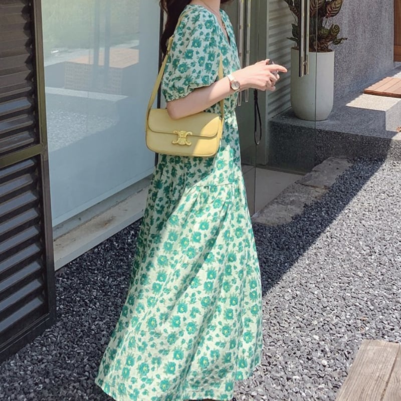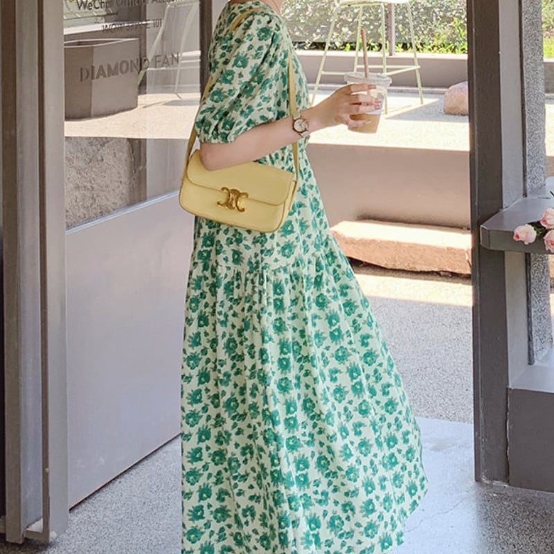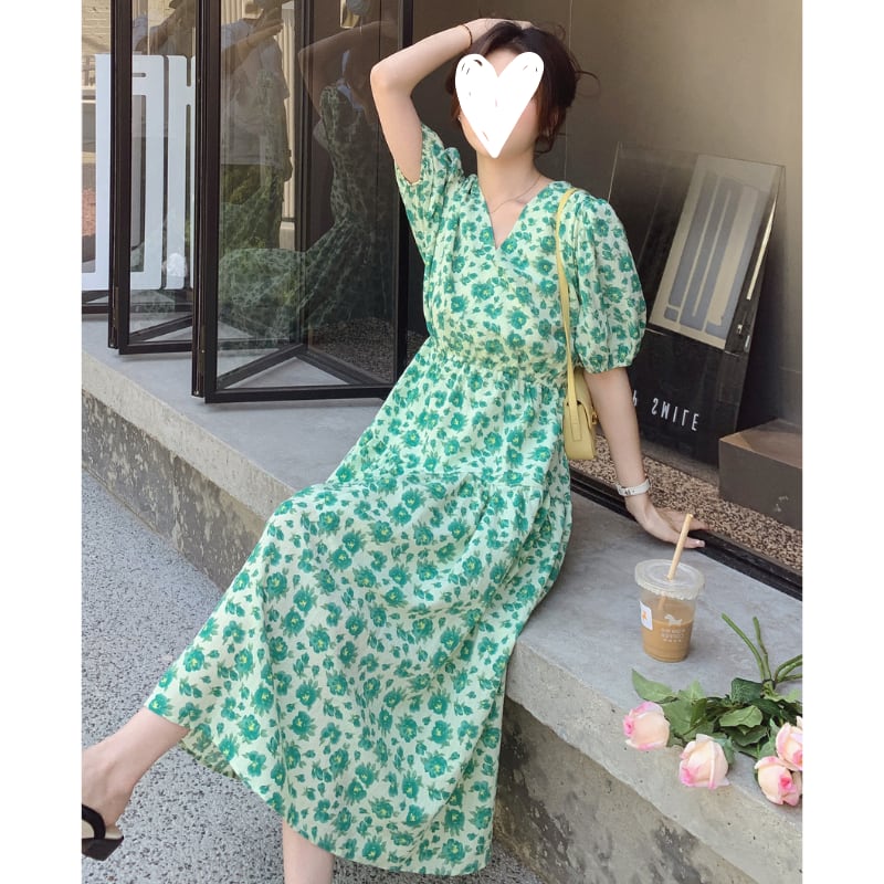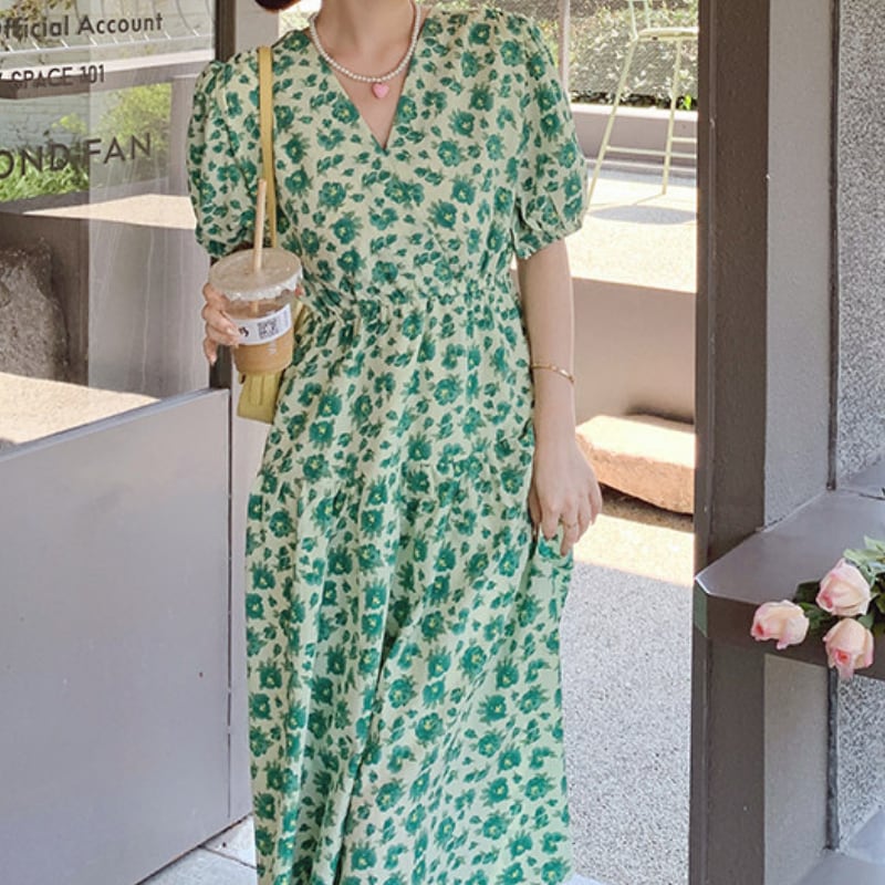 wonder green flower garden puff sleeve dress e1917