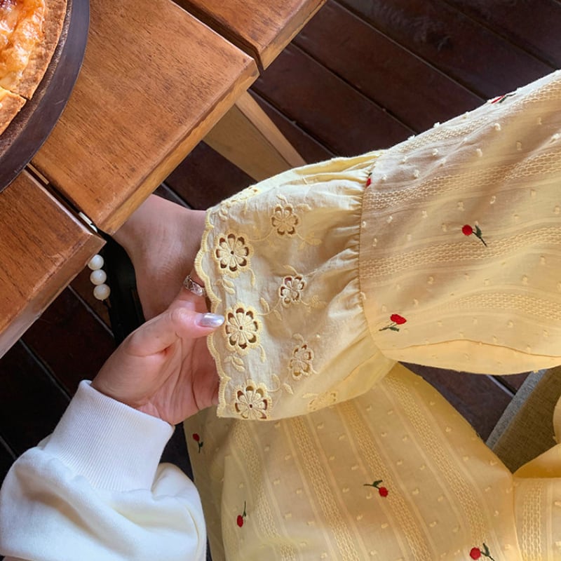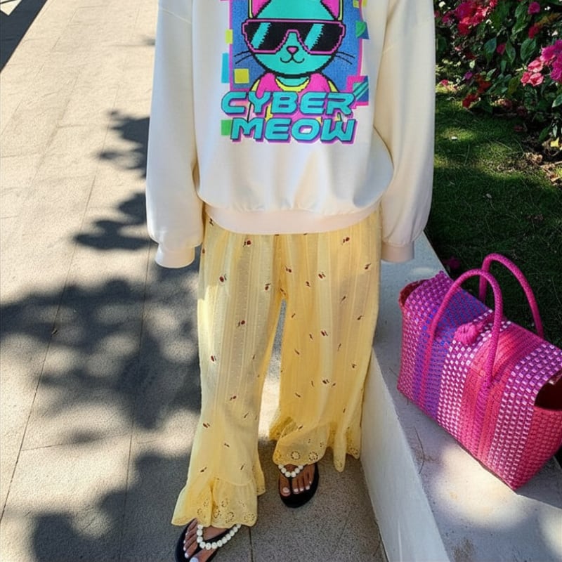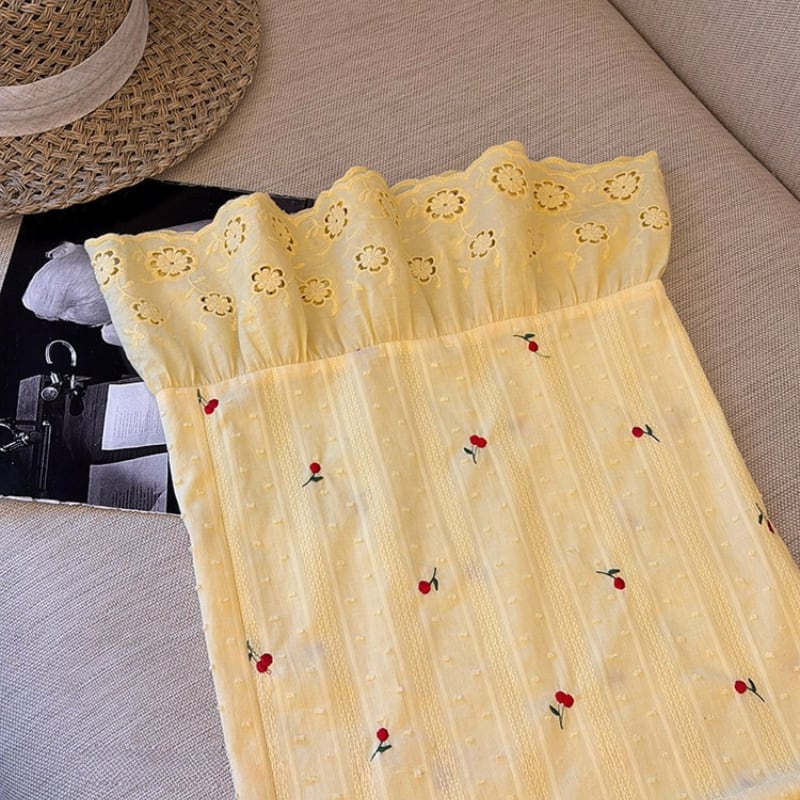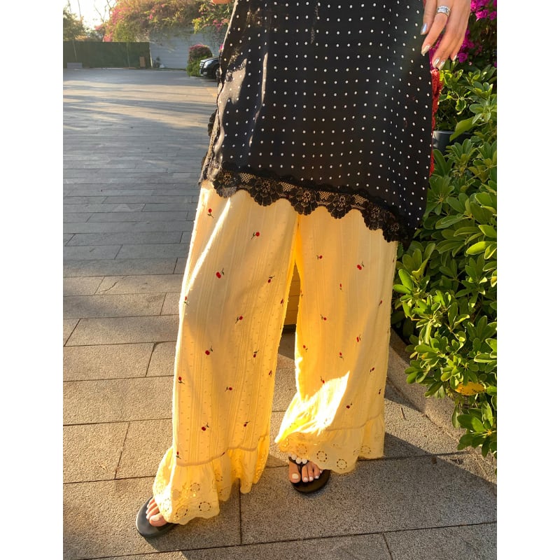 cherry embroidery lemon cream lace hem pants e1937