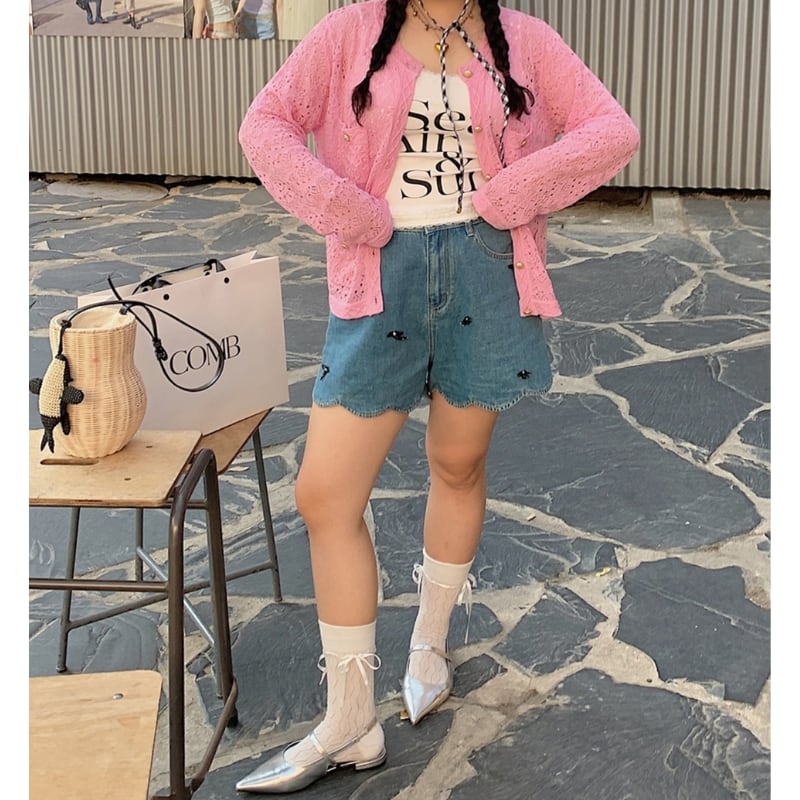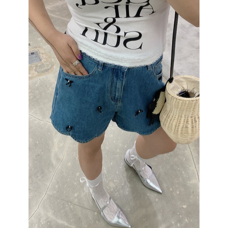 scalloped ribbon denim short pants e980