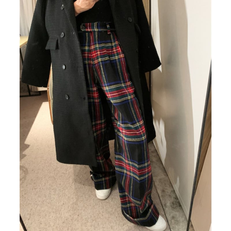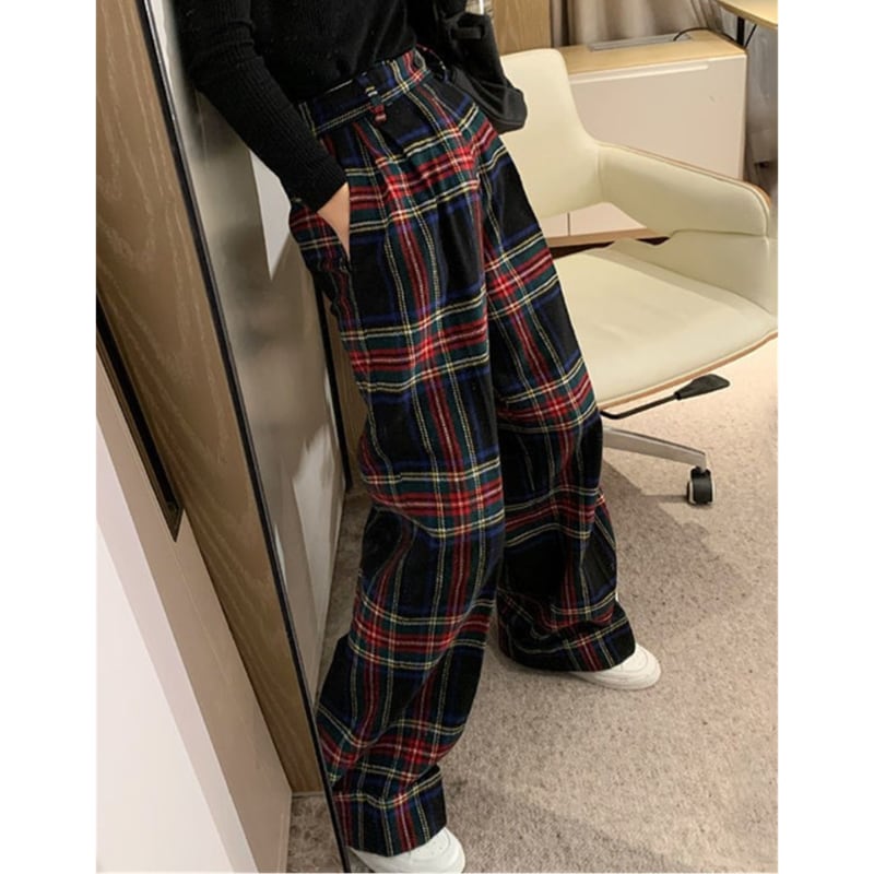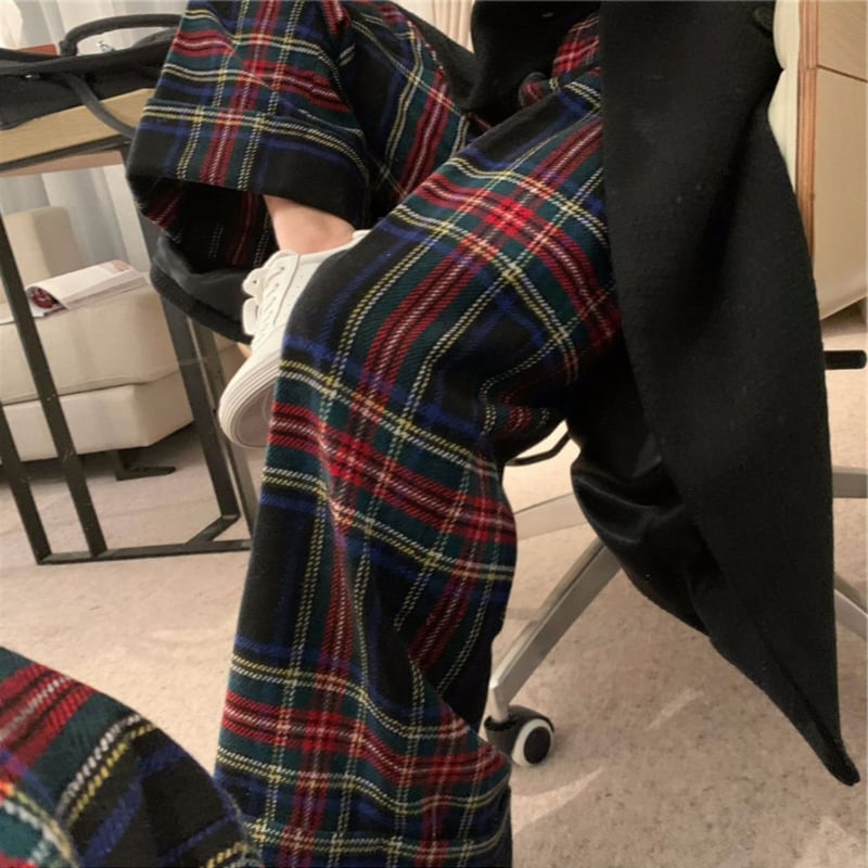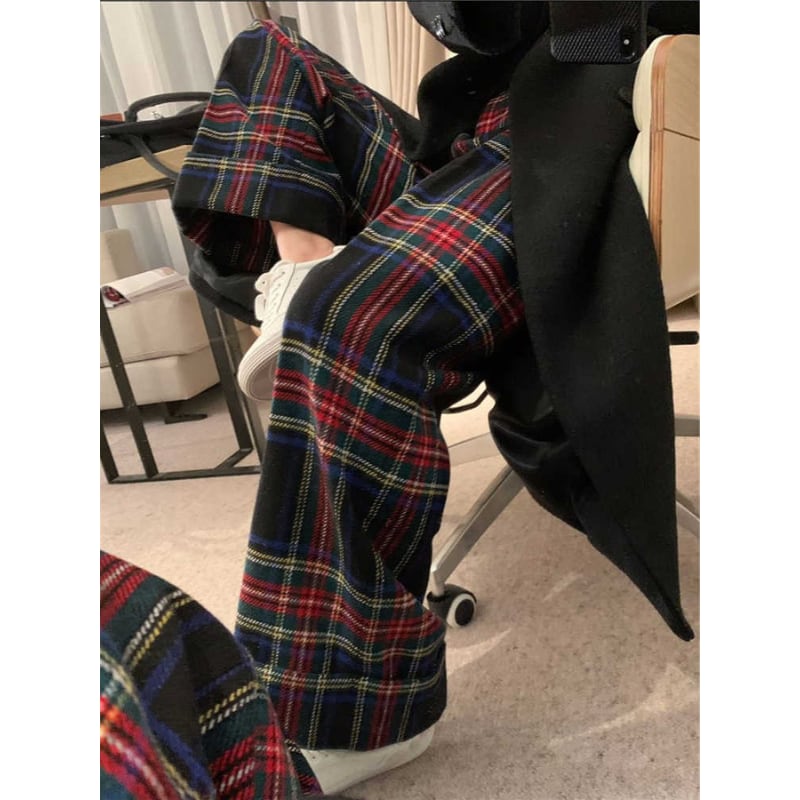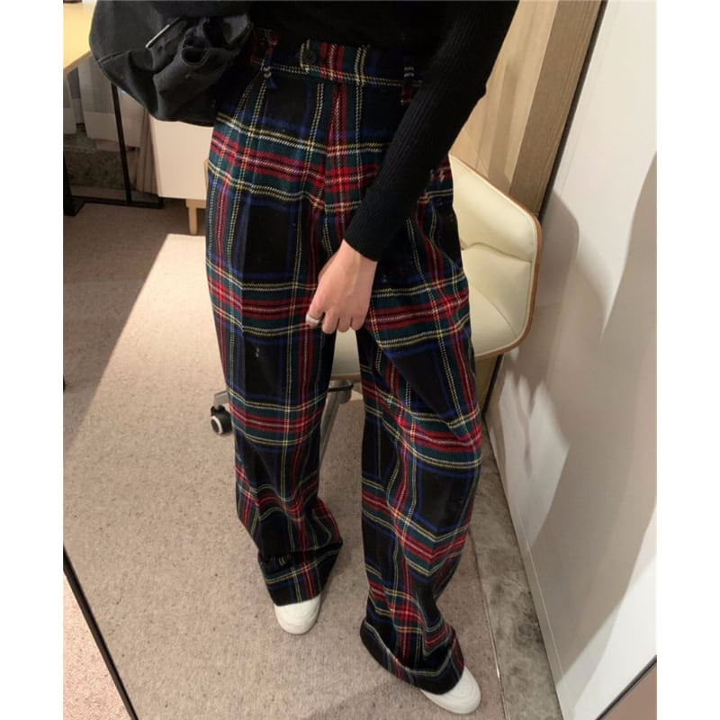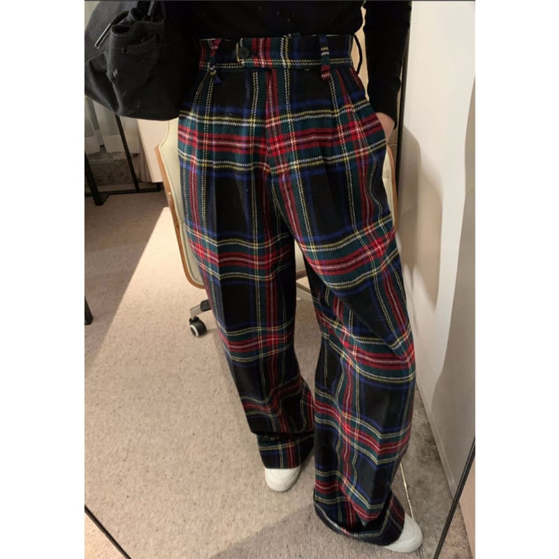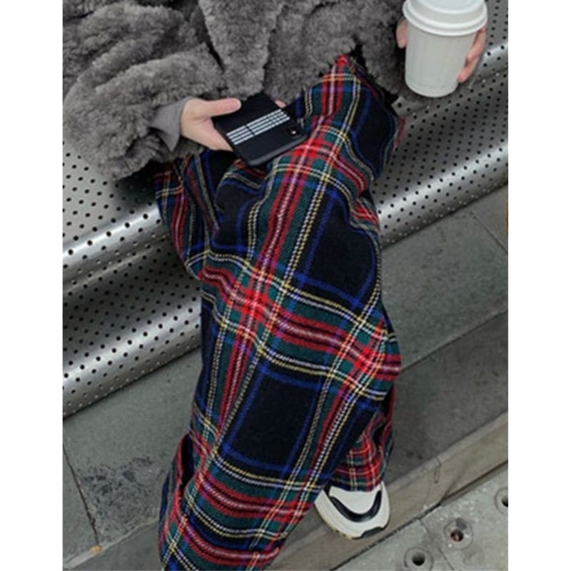 retro tartan check wool like pants e1156